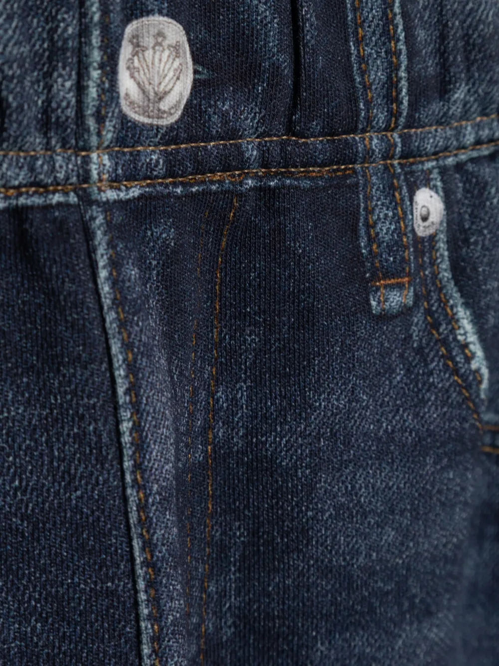 Потертые края, эластичный пояс, пять карманов, шлевки для ремня, застежка на пуговицу