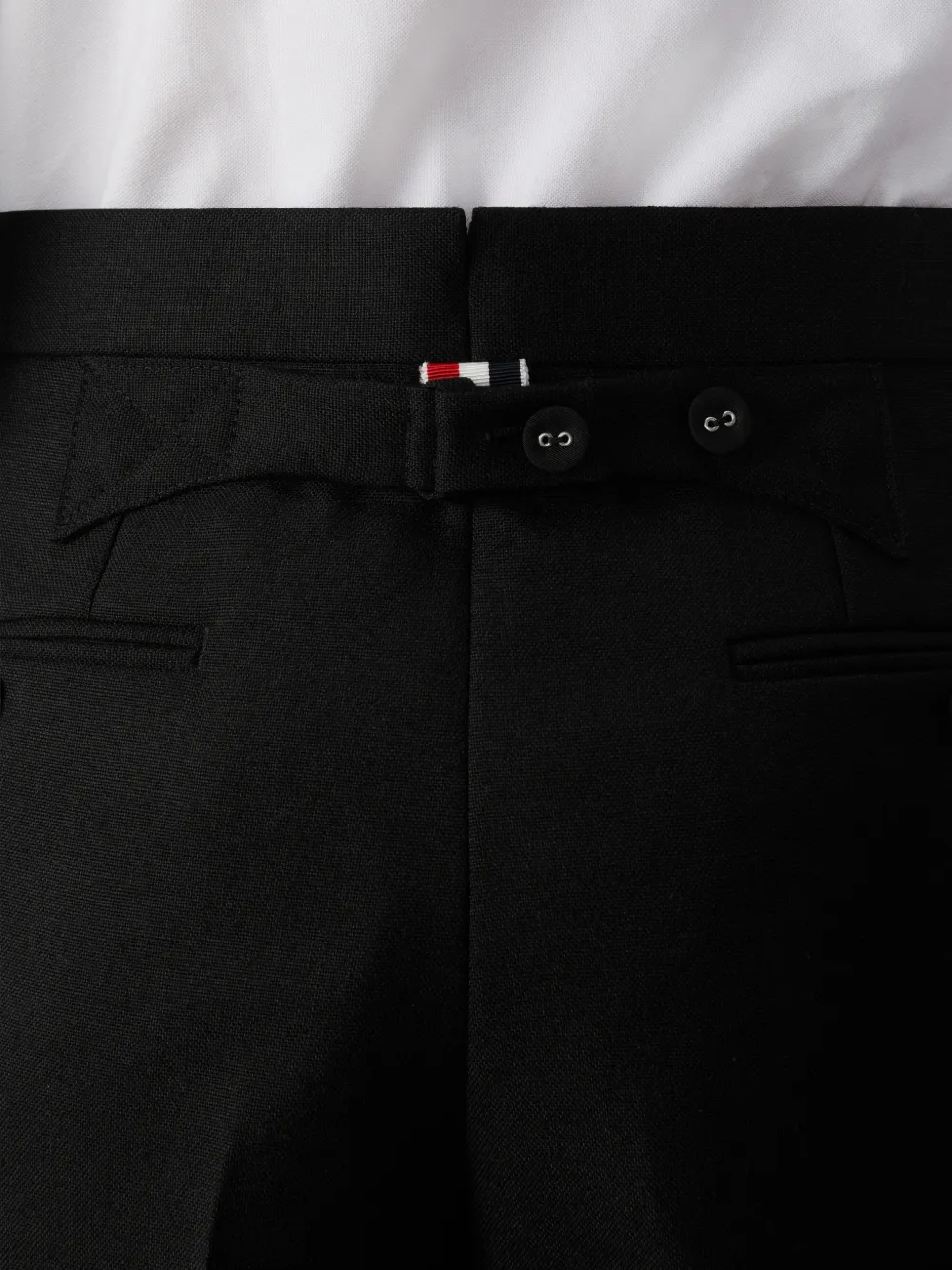 Черный, задний прорезной карман, потайная застежка, фирменная петля из полосатого гросгрейна