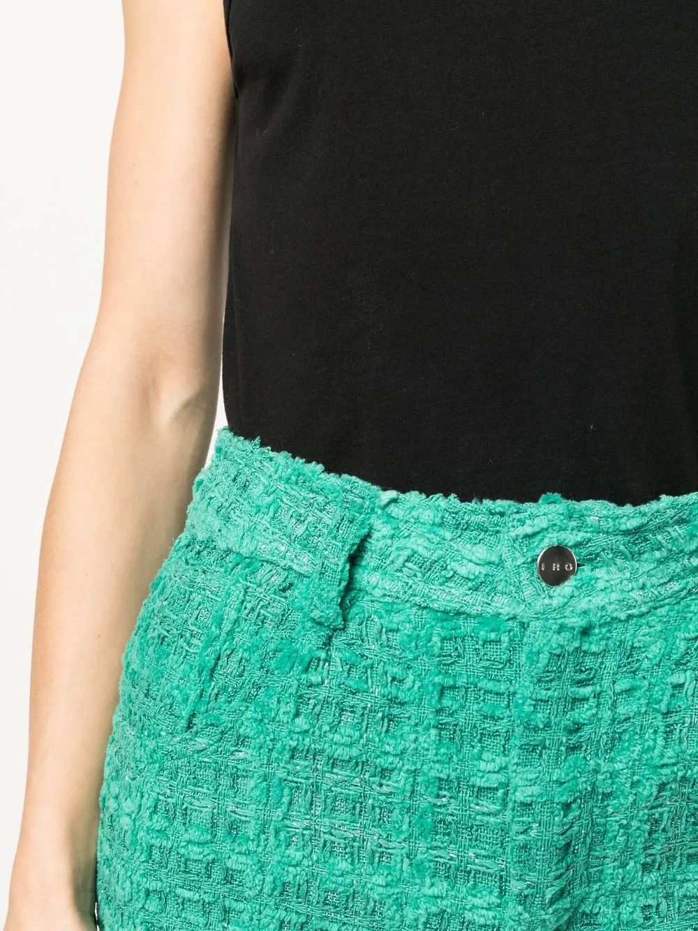 Зеленый, смесовый хлопок, твидовая ткань, низкая посадка, потайная застежка на молнии и пуговицах, петли для ремня, пять карманов, края с бахромой и длина до бедер.