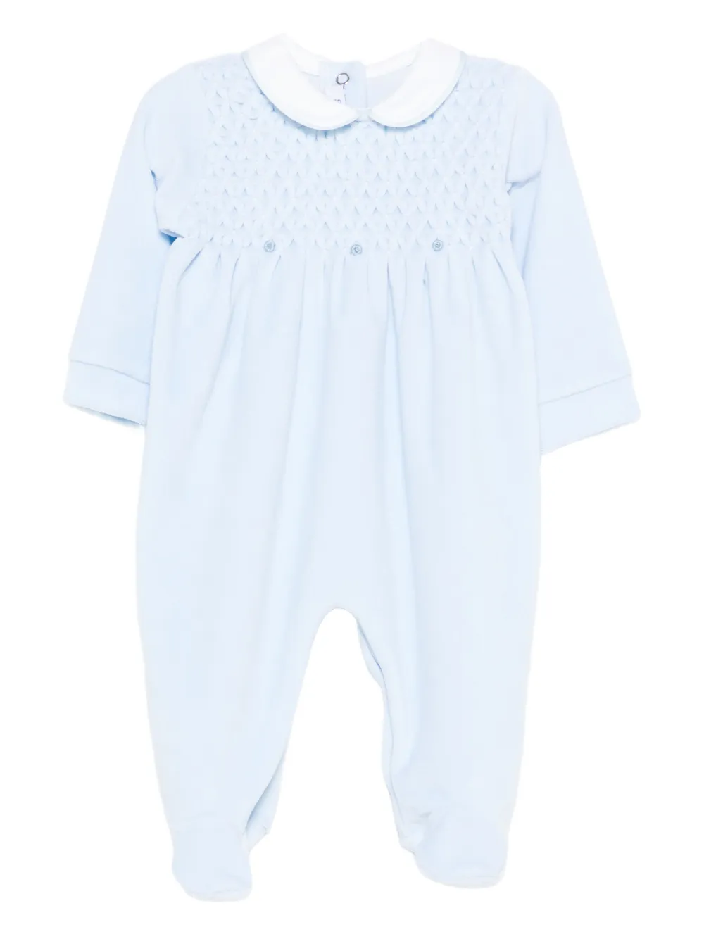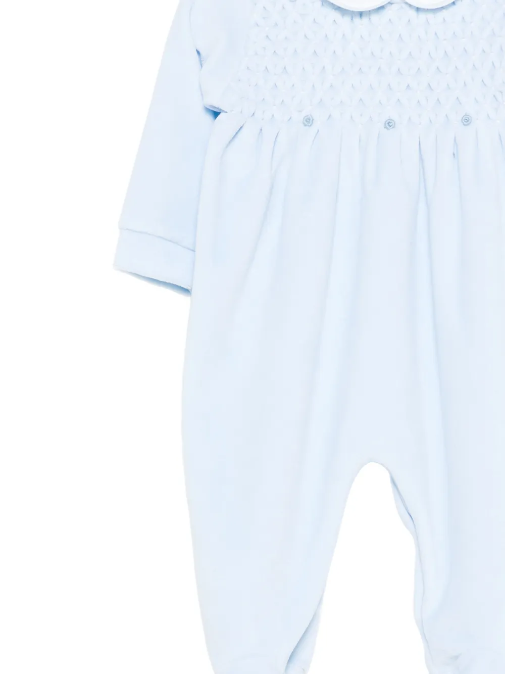 Небесно-голубой комбинезон с отделкой в виде сборок, круглым воротником, застежкой на пуговицы, длинными рукавами и закрытыми ножками