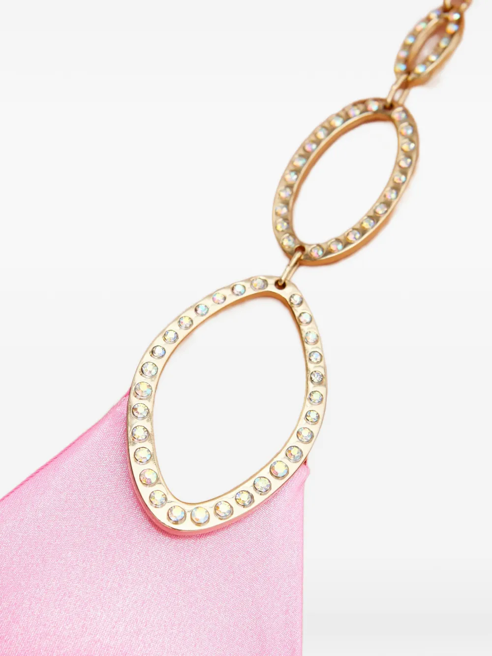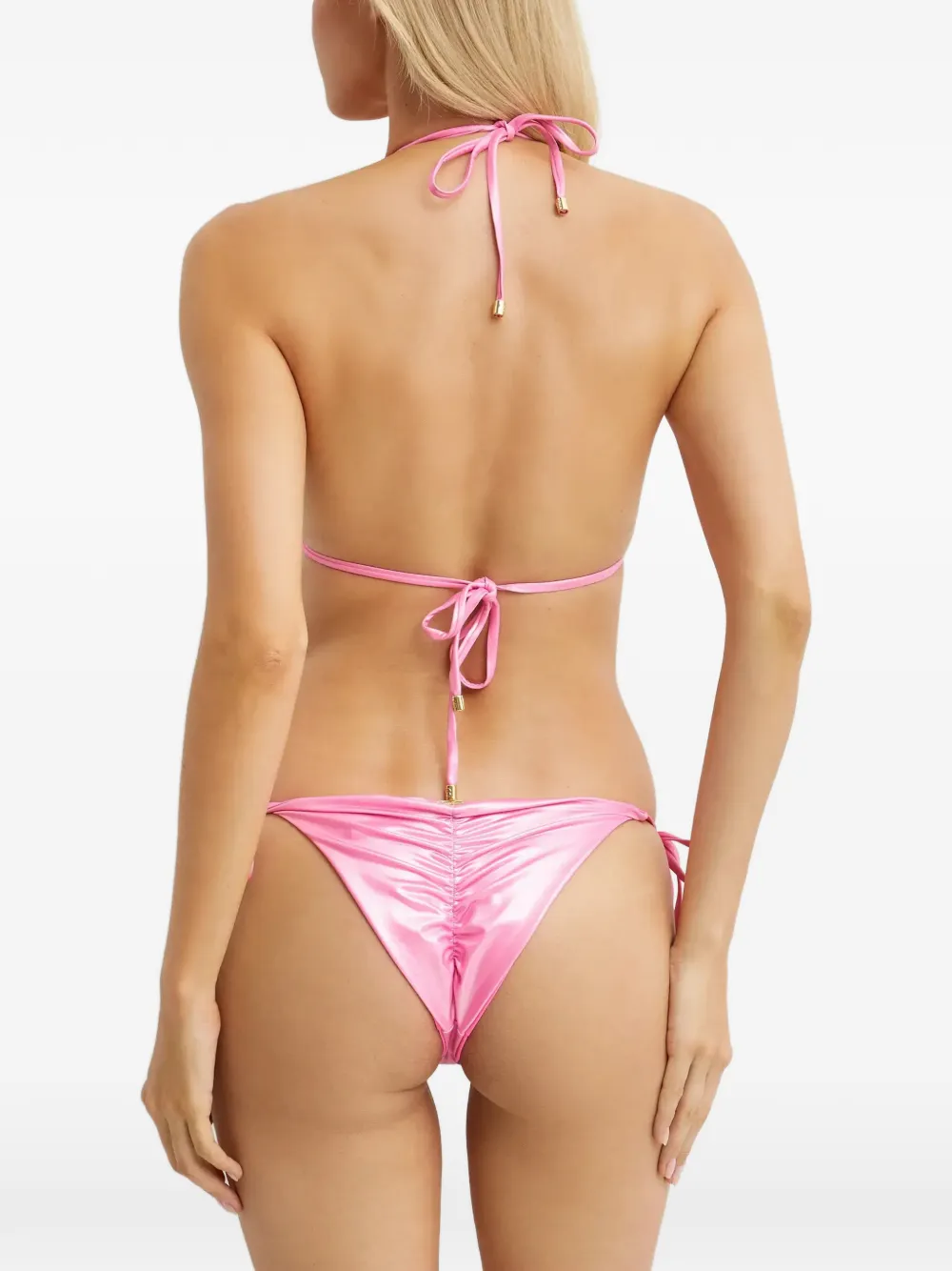 • Розовый металлизированный финиш, детализация в виде колец, чашечки треугольной формы, завязки на шее, завязка сзади