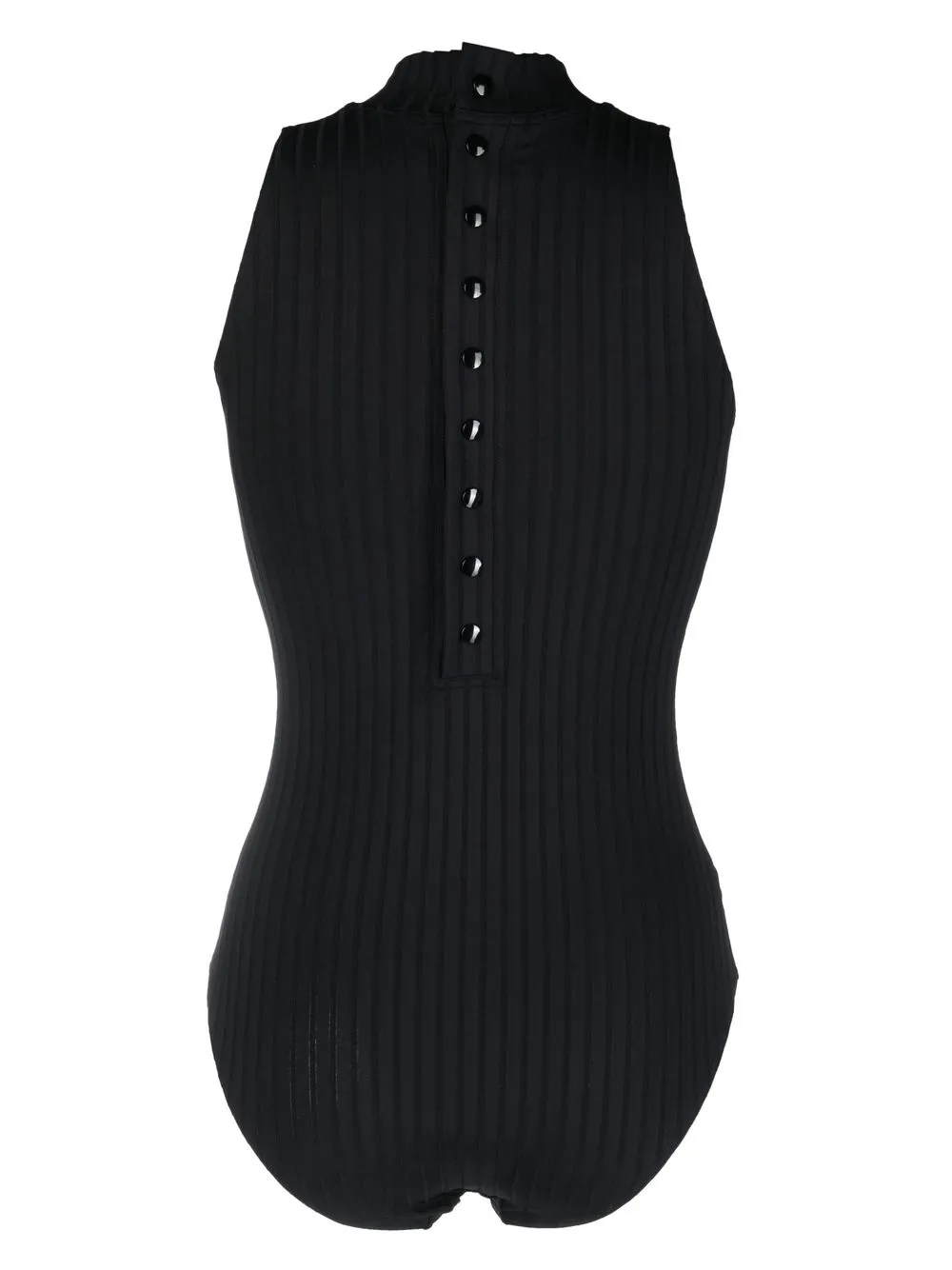Черный, детали в рубчик, эластичный материал, высокий воротник, застежка на кнопках сзади и без рукавов. Пожалуйста, примеряйте купальники и пляжные шорты только поверх собственного белья.