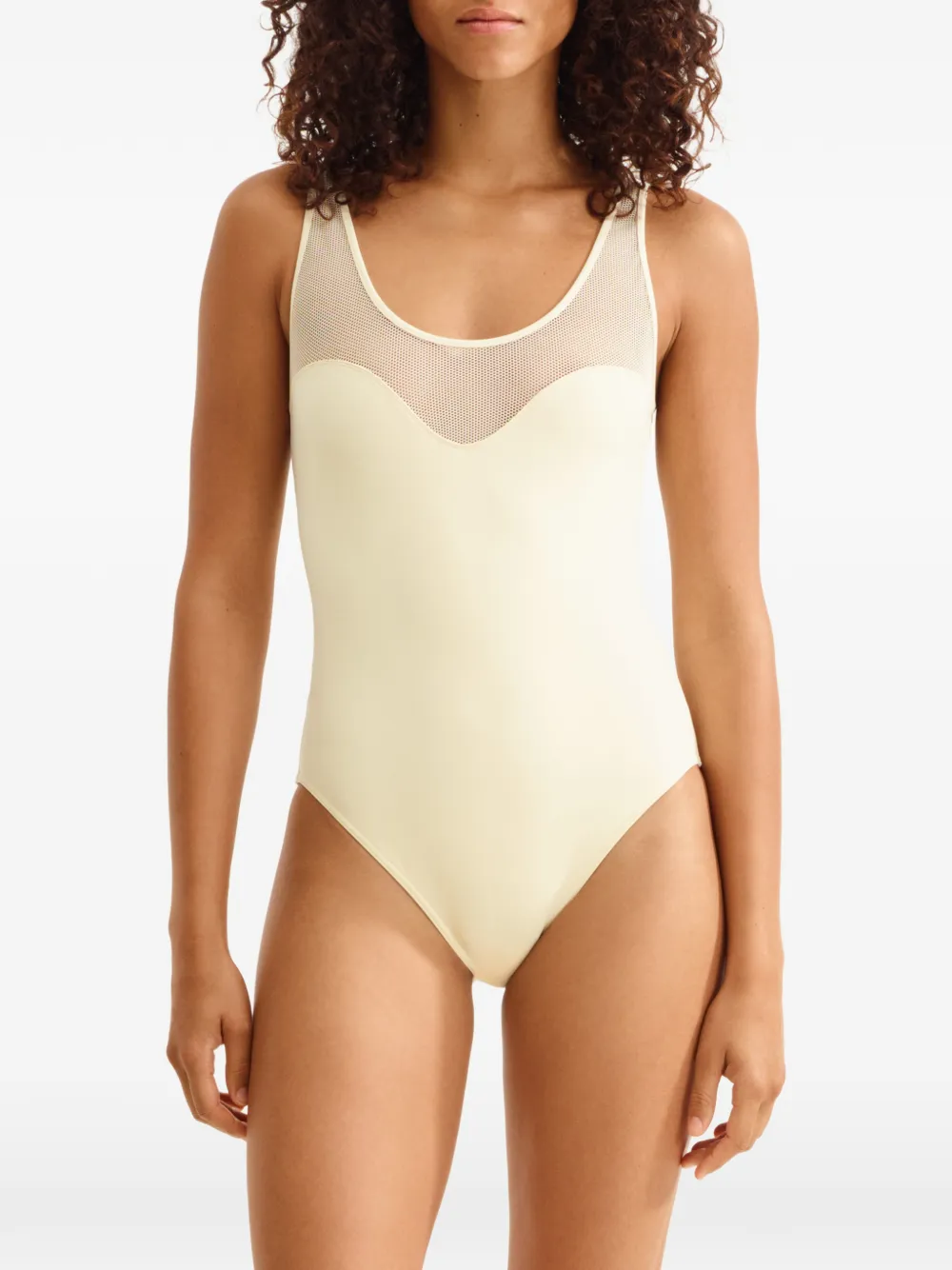 Бежевый купальник с сетчатыми вставками, круглым вырезом спереди, без рукавов, с глубоким вырезом на спине. Обратите внимание: примеряйте купальник поверх собственного белья.