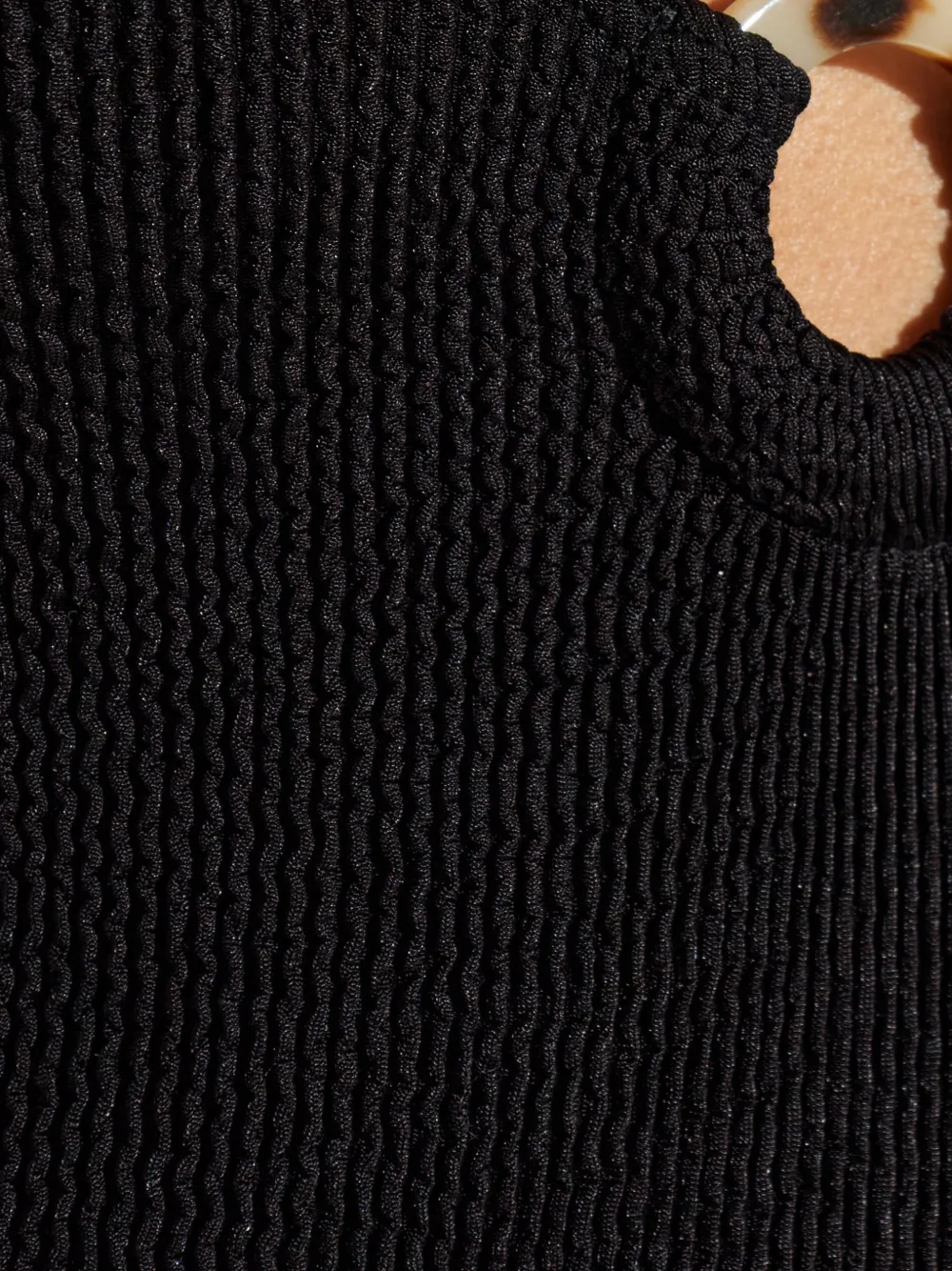 Черный купальник с мерцающим эффектом, отделкой кольцом, текстурированной поверхностью, глубоким V-образным вырезом, широкими бретелями и открытой спиной. Пожалуйста, примерьте купальник поверх своего белья.