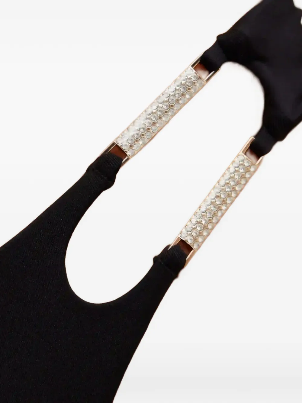Черный украшенный кристаллами, с вырезами по бокам, с табличкой-логотипом, со сборками. Пожалуйста, примерьте купальник поверх собственного белья.