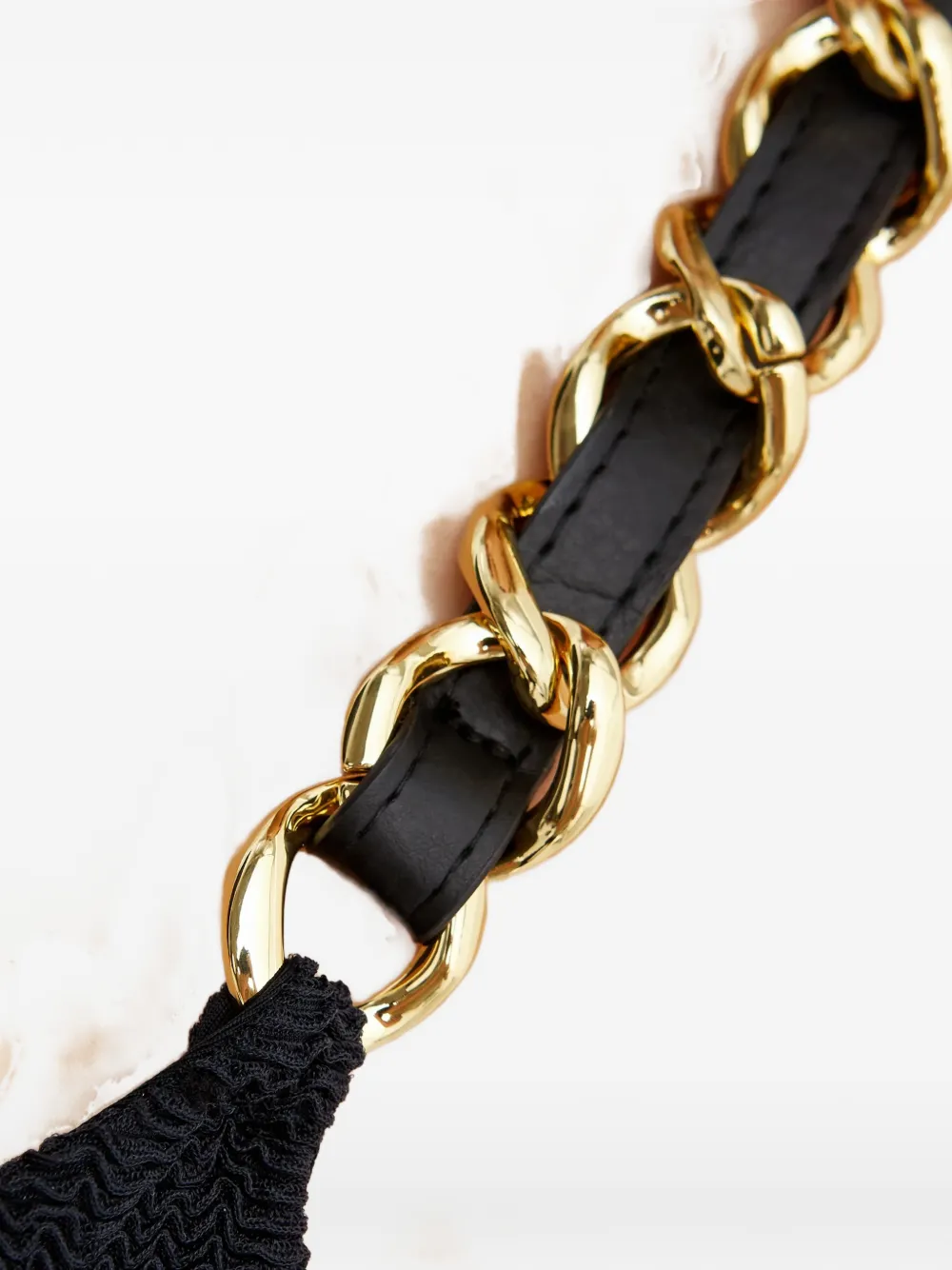 Черный купальник с фактурной отделкой, чашечки-треугольники, отделка цепочкой золотистого цвета, застежка-завязка сзади. Пожалуйста, примерьте купальник поверх собственного белья.