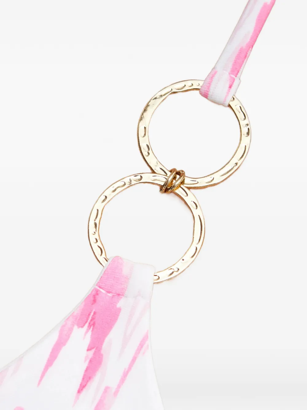 Белый, розовый принт, кольца золотистого оттенка, завязки на шнуровке. Пожалуйста, примерьте купальник поверх собственного белья.