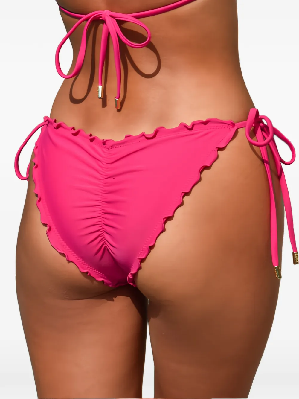 Розовая отделка с оборками, завязки, металлическая деталь с логотипом, сборки; Примеряйте купальники поверх собственных вещей.