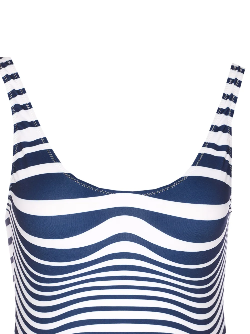 Синий-белый купальник с принтом, на бретелях. Примеряйте купальник поверх собственного белья.