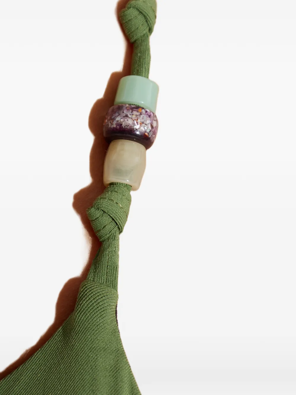 Черная и зеленая отделка из бусин, завязывается на завязки, двусторонняя. Обратите внимание: примеряйте купальники поверх собственного белья.