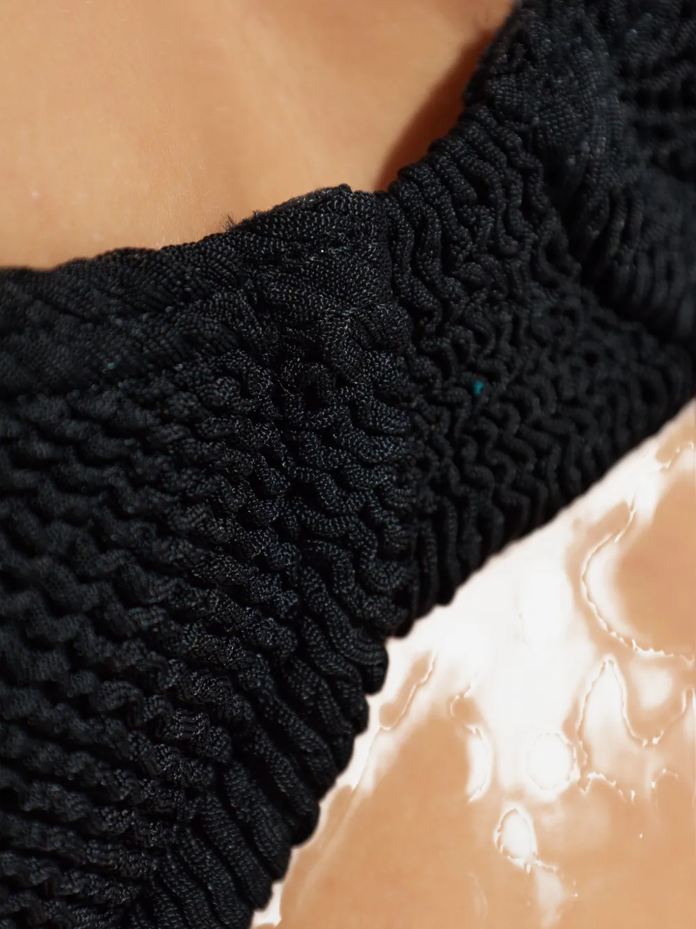 Черная фактура, тонкие бретели. Пожалуйста, примерьте купальник поверх собственного белья.