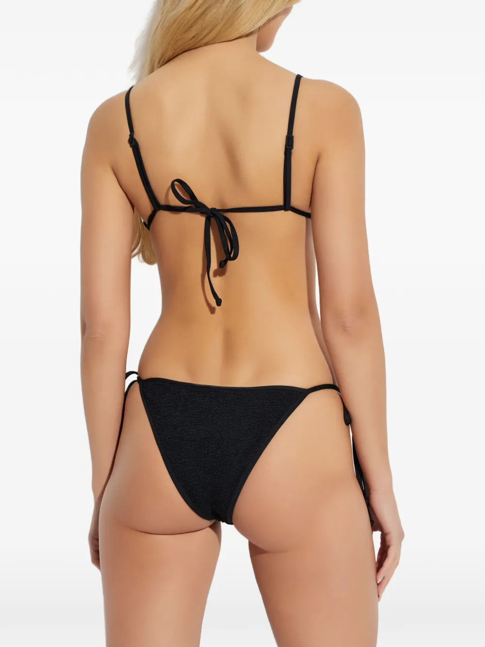 Черный цвет, завязка, треугольные чашки, бретели-веревочки, текстурированная отделка, регулируемые бретели. Пожалуйста, примерьте купальник поверх собственного белья.