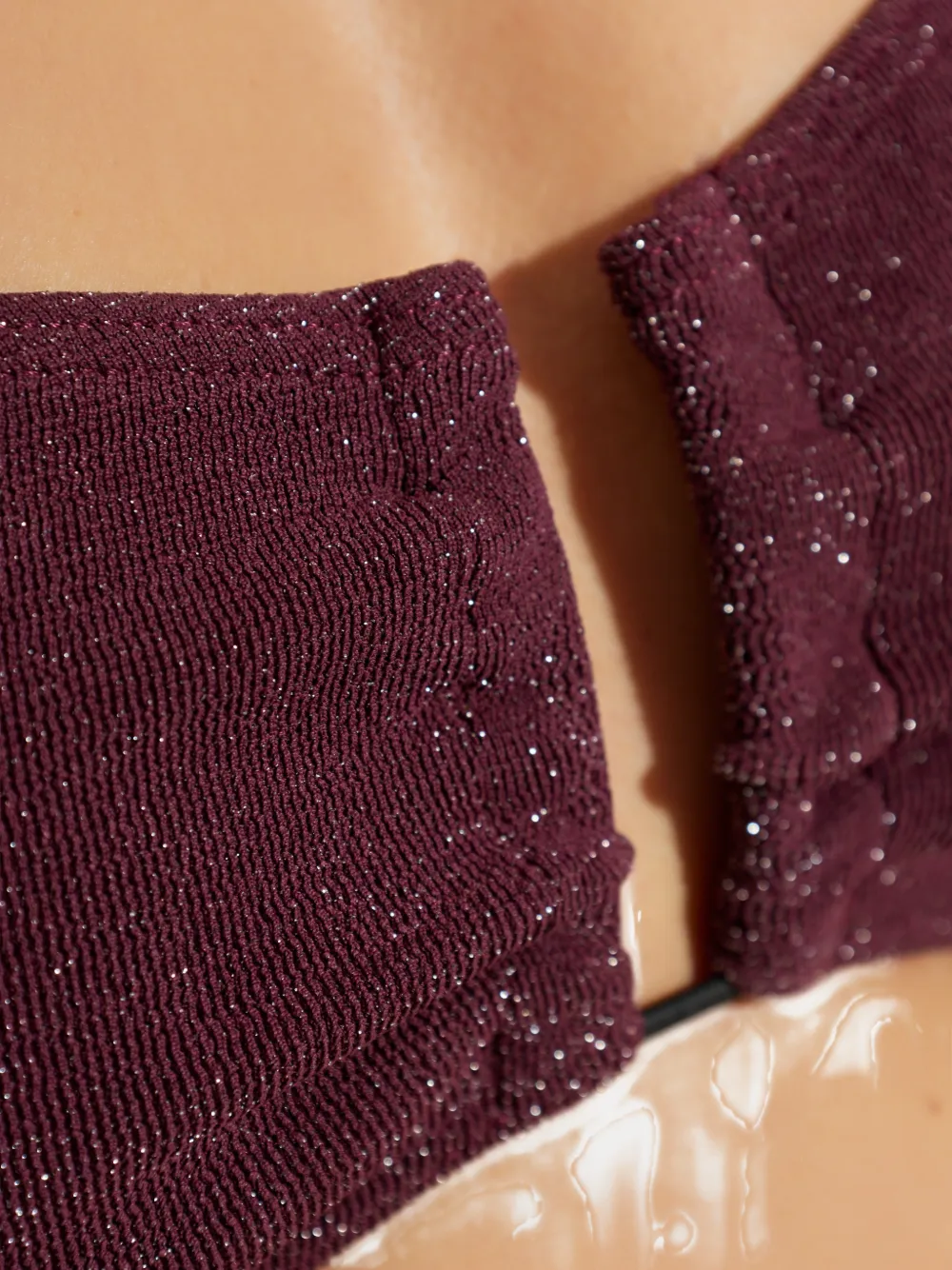 Темно-красная текстурированная отделка, вырезы. Пожалуйста, примерьте купальник поверх собственного белья.