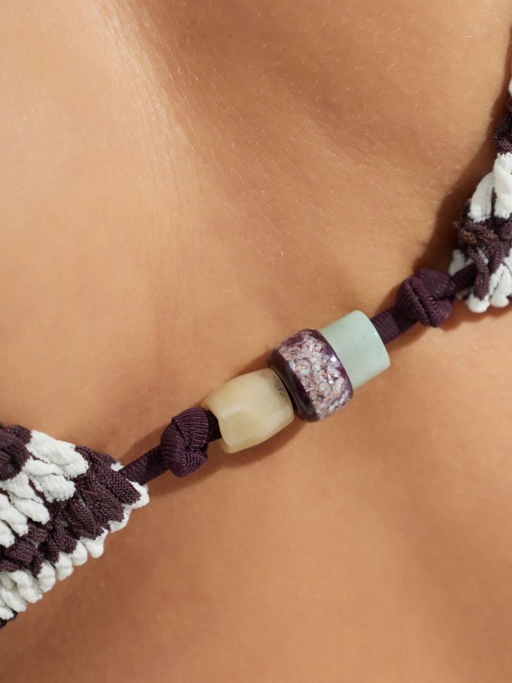 Треугольный топ с бисерными деталями, завязками и полосатым узором в песочно-коричневых и белых тонах; плавки на завязках по бокам. Пожалуйста, примерьте купальник поверх собственного белья.