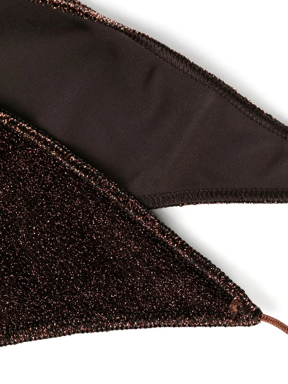 Шоколадный, эластичный материал, люрекс, завязки вокруг шеи, застежка на завязке сзади и плавки бикини с завязками по бокам. Пожалуйста, примеряйте купальники и пляжные шорты только поверх собственного белья.