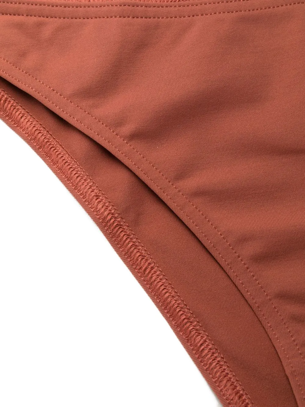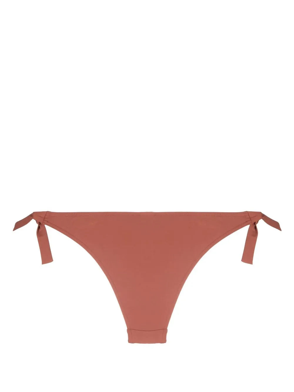 Коричневый, эластичный материал, завязки по бокам и высокий вырез. Пожалуйста, примеряйте купальники и пляжные шорты только поверх собственного белья.