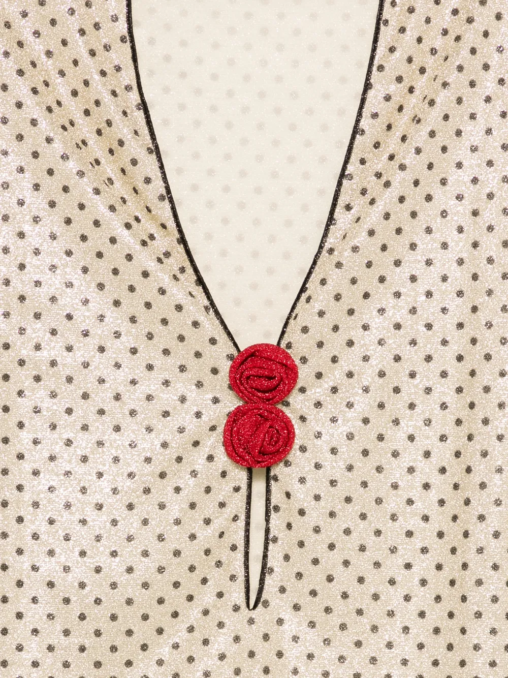 Черное платье в горошек с розой, V-образным вырезом, длинными рукавами и черной отделкой