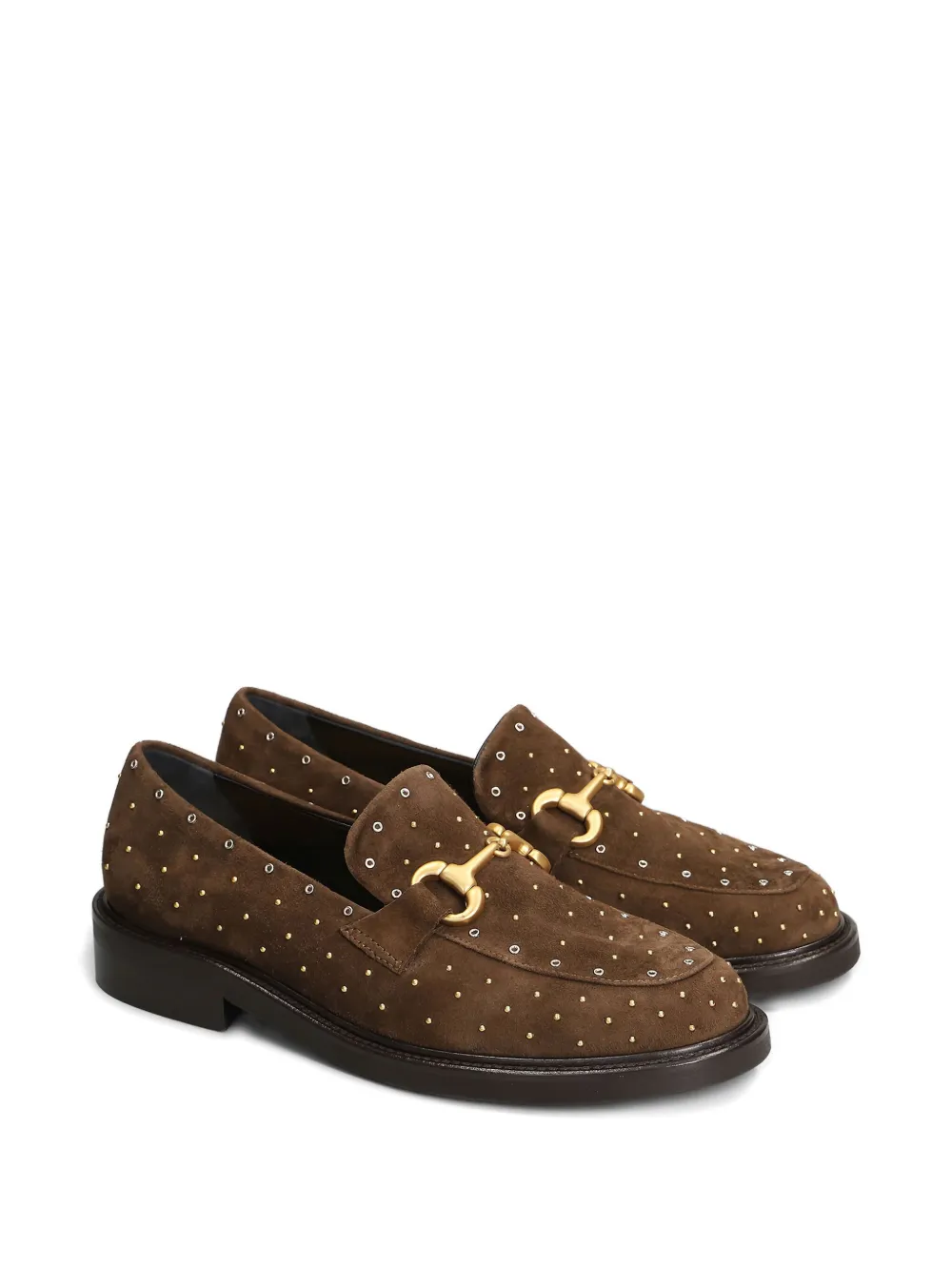 Коричневый, фурнитура золотистого оттенка, украшения в виде заклепок, модель без застежек, круглый носок, плоская подошва