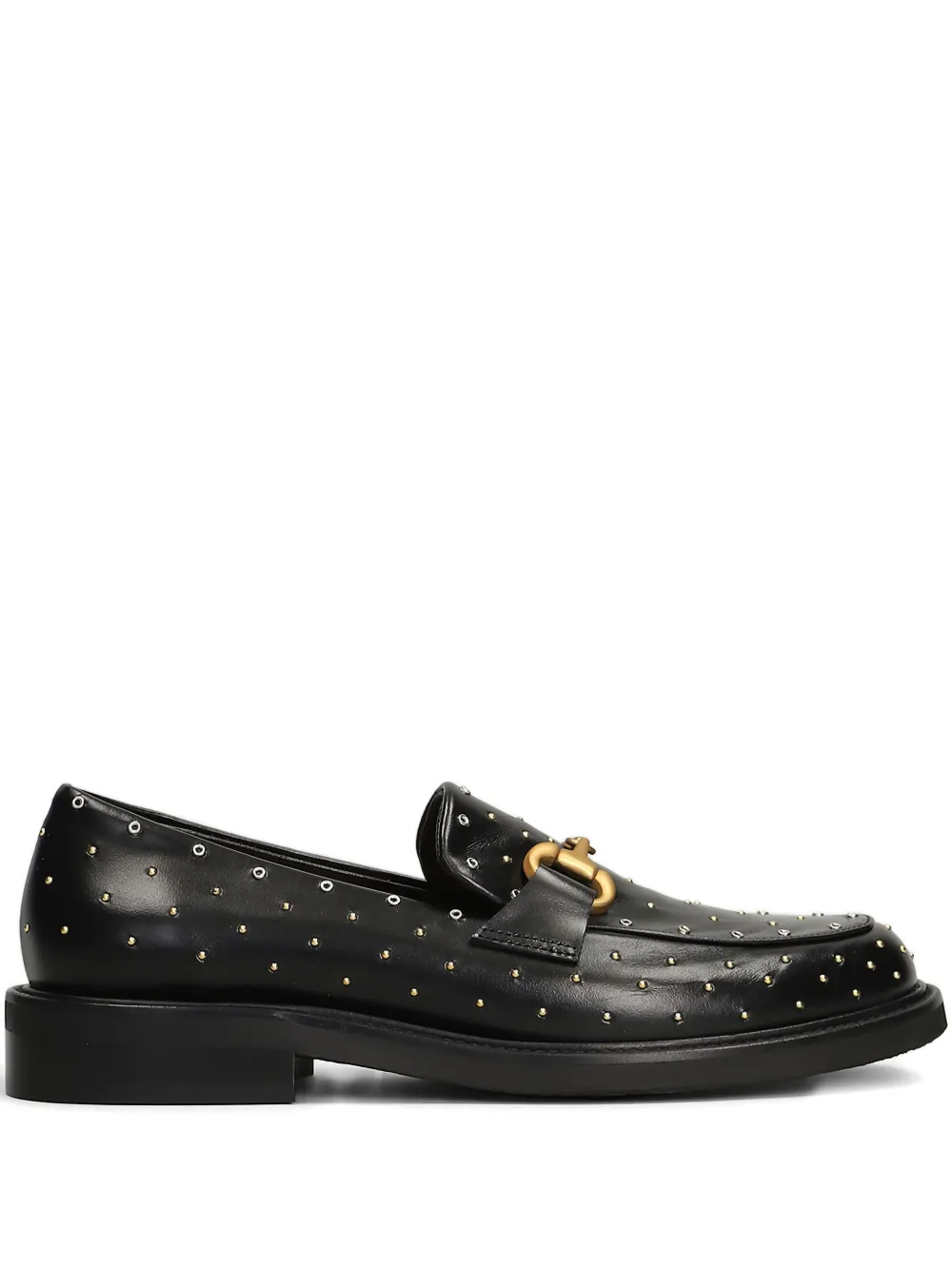 Черный, фурнитура золотистого оттенка, украшения в виде заклепок, модель без застежек, круглый носок, плоская подошва