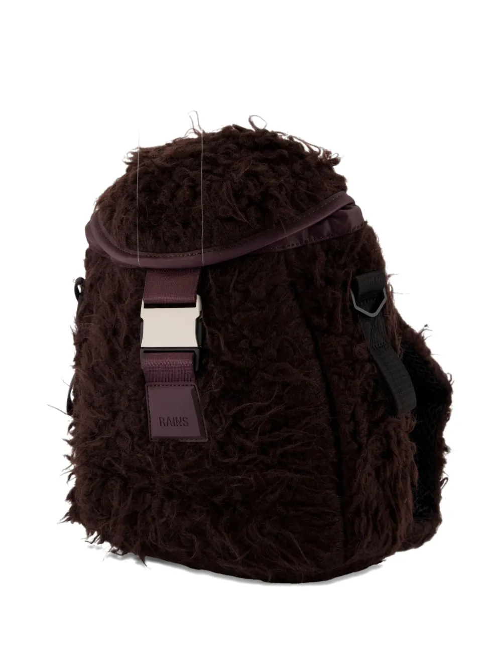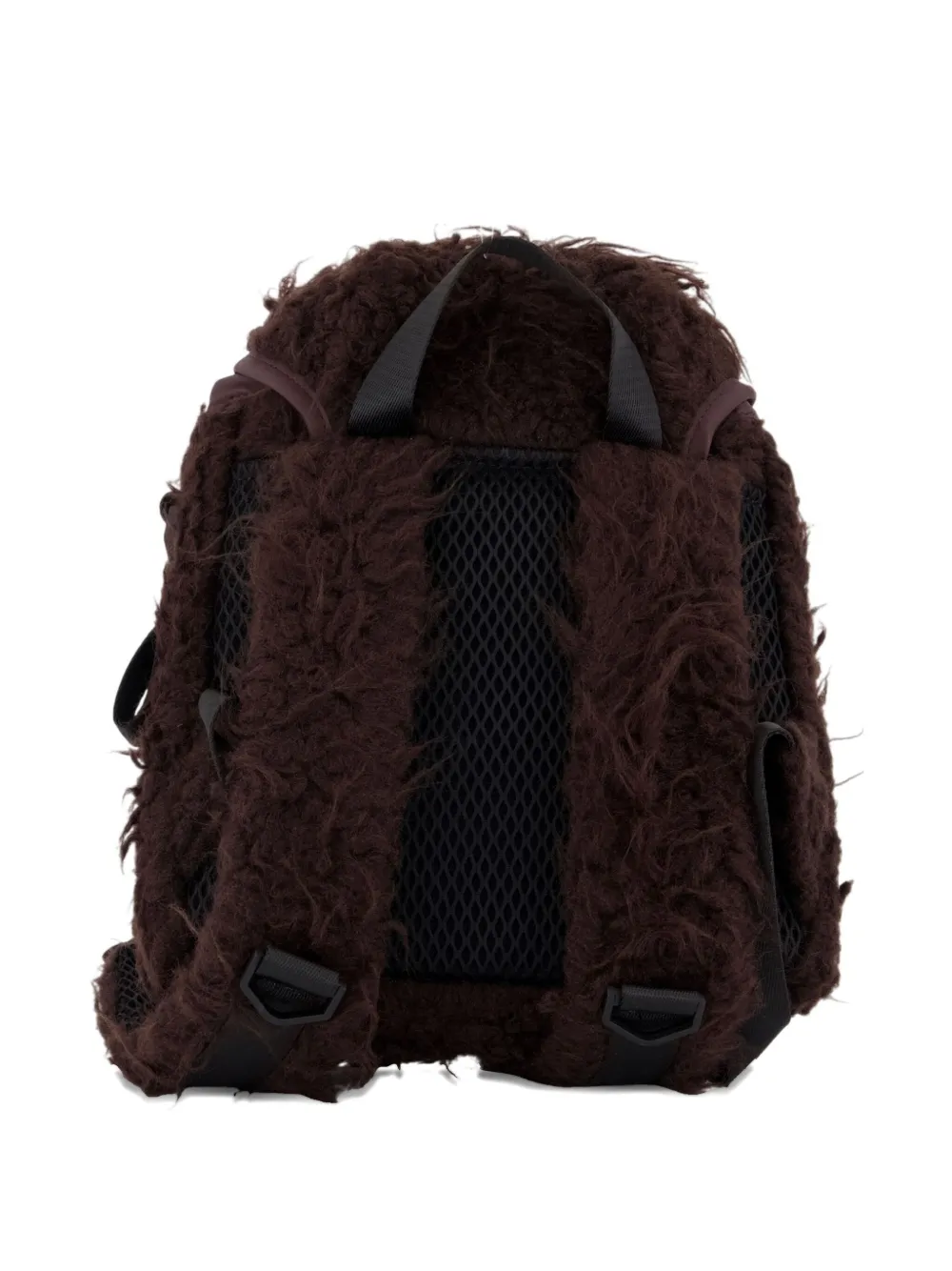 Темно-коричневый, пушистая фактура, регулируемые плечевые ремни, застежка-пряжка, верхний клапан, задняя панель из сетки