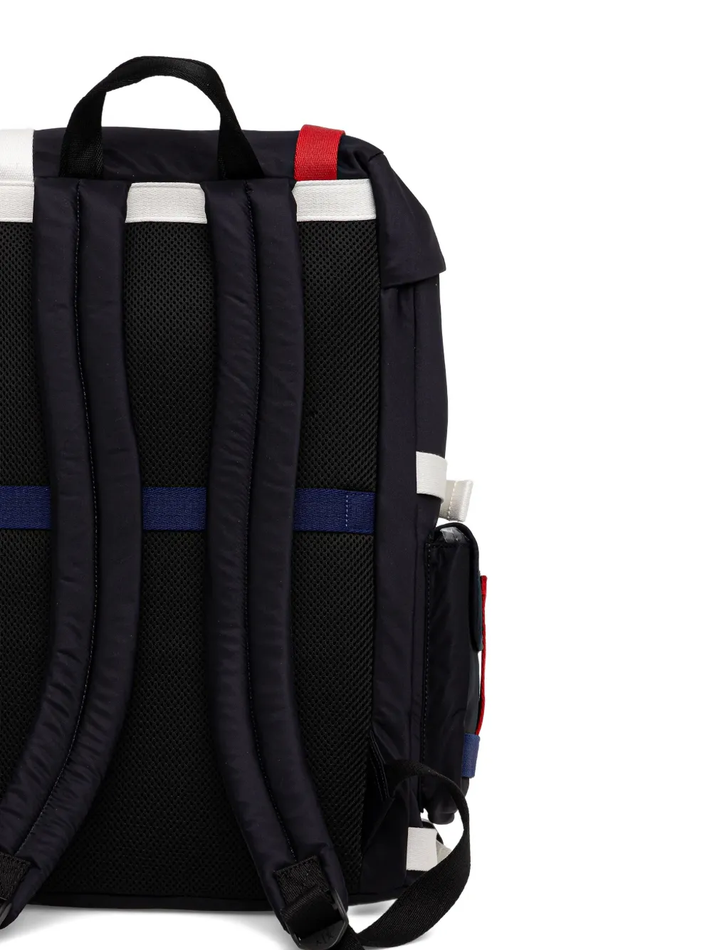 Темно-синий с полосатыми деталями, застежкой-пряжкой, верхней ручкой, передними карманами, регулируемыми плечевыми ремнями