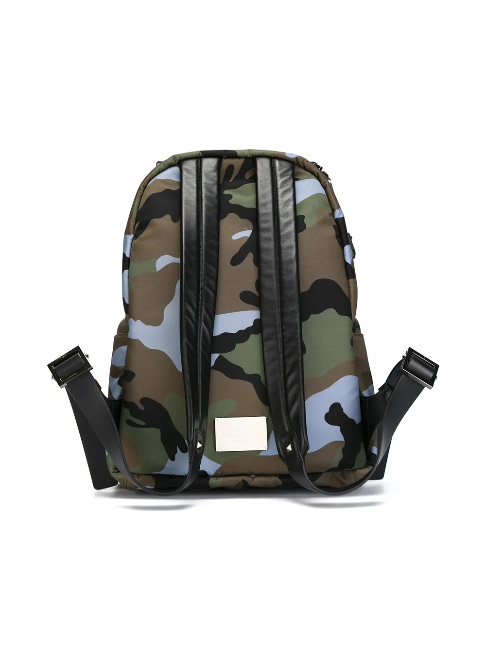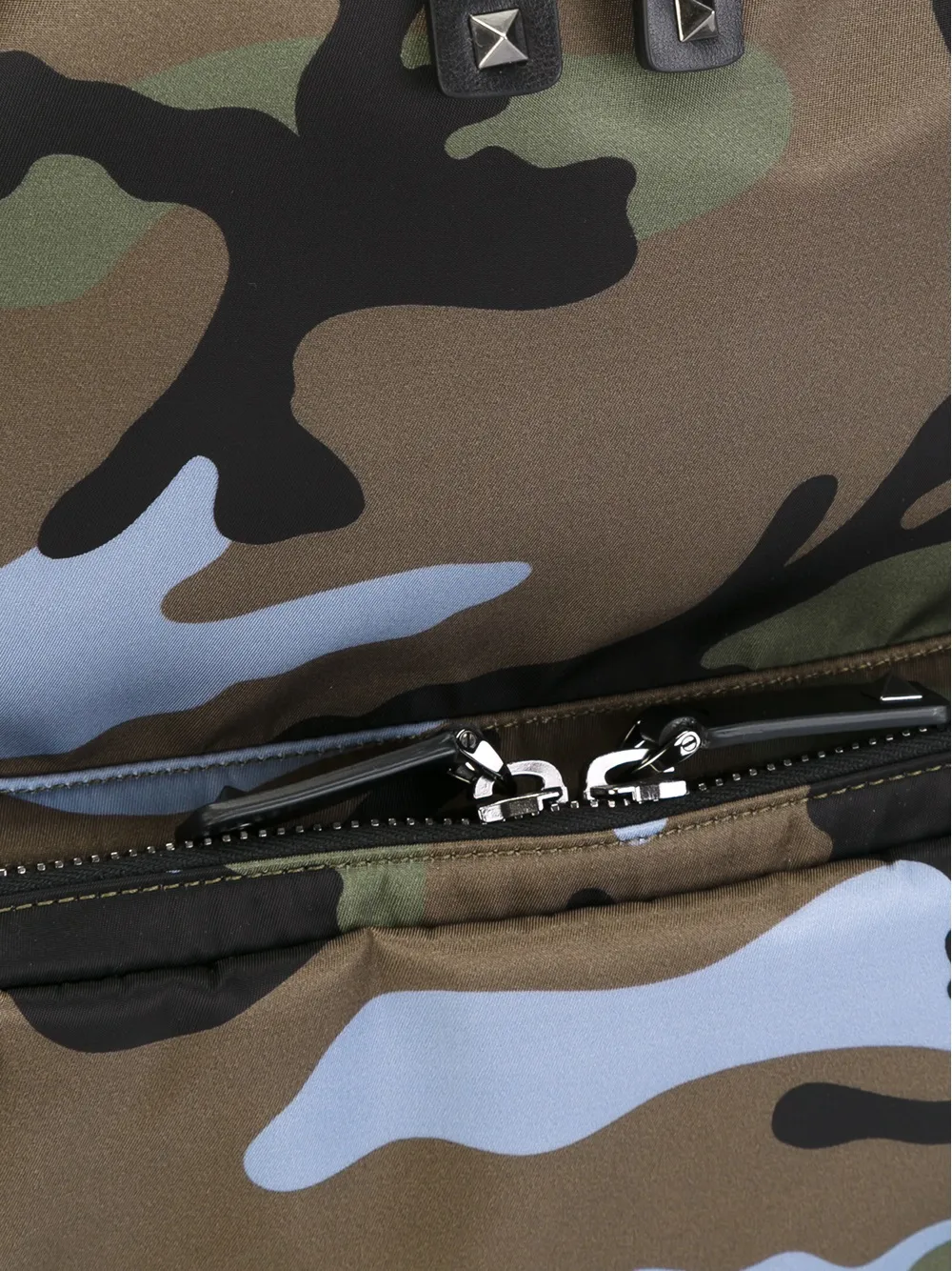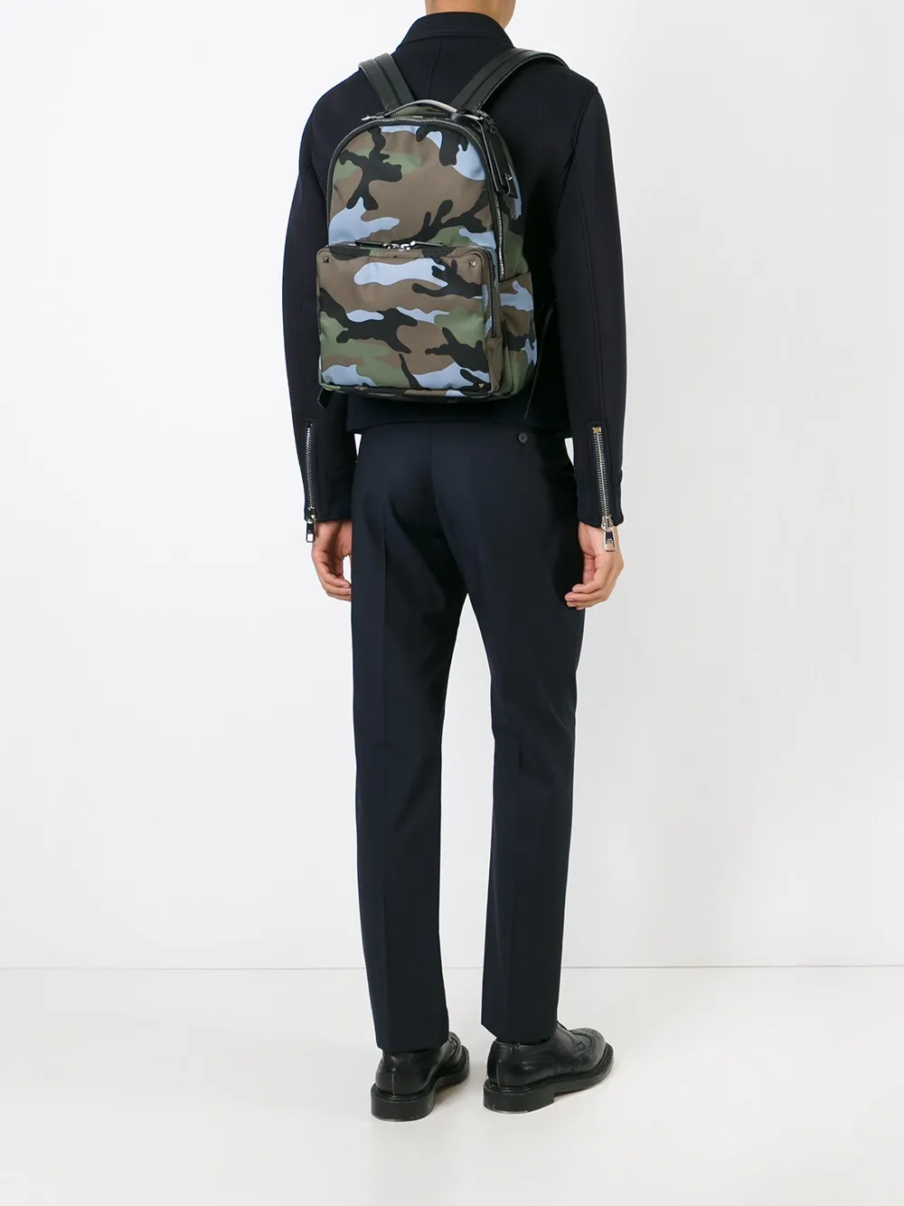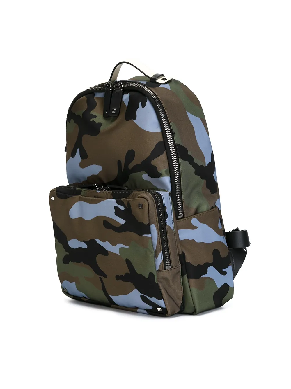 Зеленый с голубым рюкзак Rockstud от Valentino Garavani. Верхняя ручка, застежка на молнии сверху, передний карман на молнии, регулируемые лямки , пирамидальные заклепки из рутения, внутренний накладной карман, внутренняя заплатка с логотипом, брендовая заплатка сзади, камуфляжный принт.