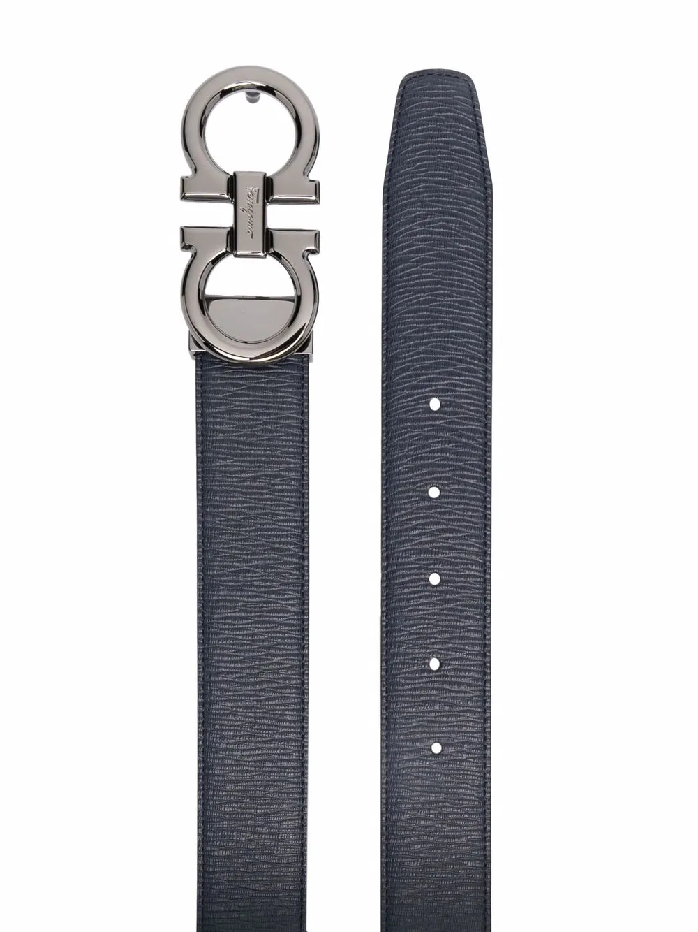 Зернистая текстура, перфорация, регулируемый дизайн и пряжка Gancini.