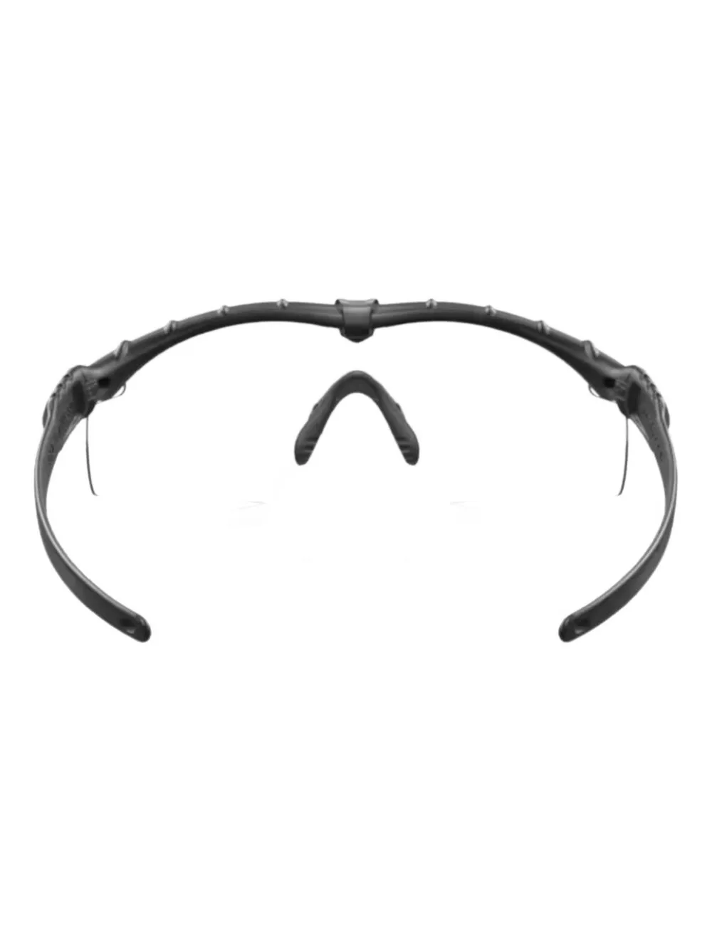 Черная геометрическая оправа, фактурные детали, тонированные линзы, носовые упоры. В комплекте идет защитный футляр.