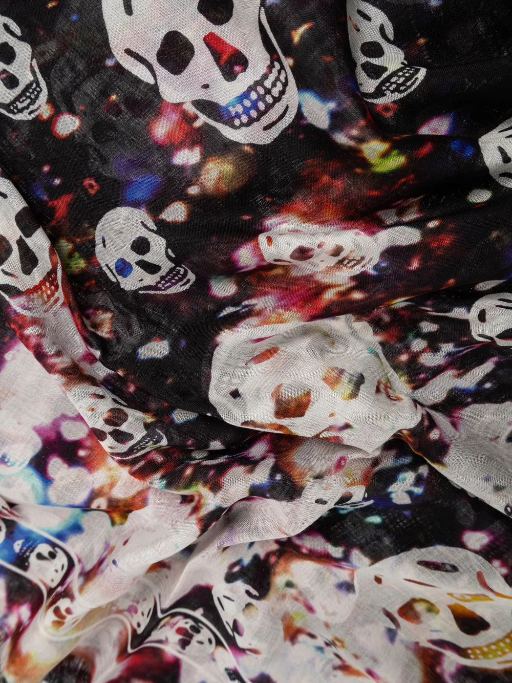Черный шарф с принтом в виде черепов и бахромой по краям