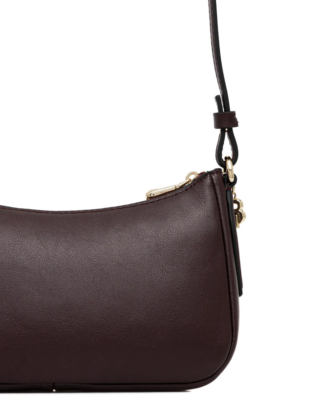 Темно-коричневый цвет, верхняя застежка на молнии, наплечный ремень, фурнитура цвета золота, декоративный брелок, внутренний открытый карман