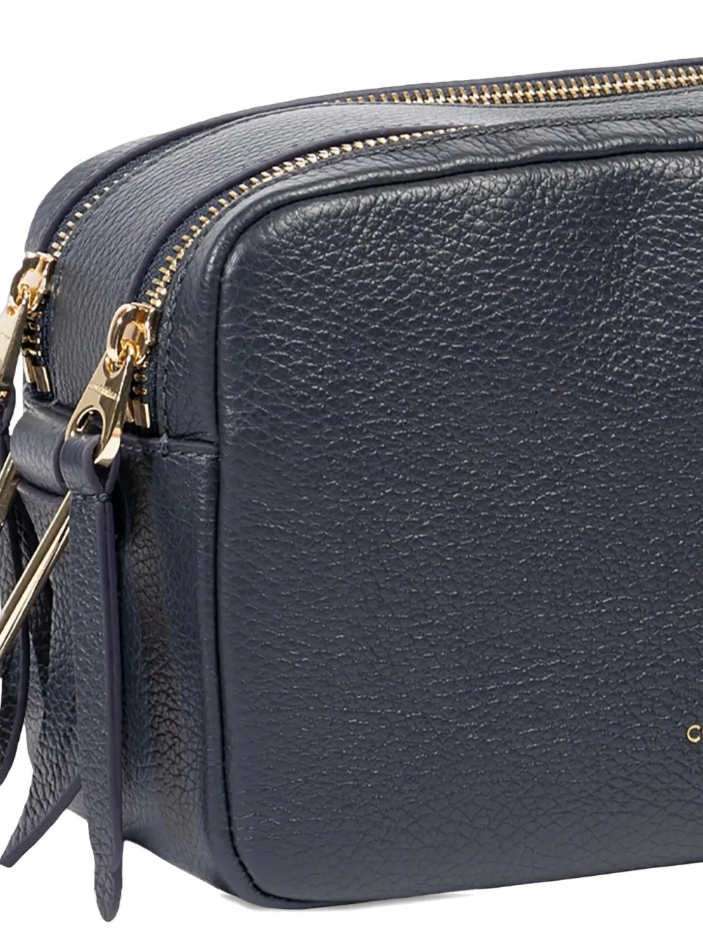 Темно-синий цвет, зернистая текстура, фурнитура золотистого оттенка, застежка на молнии, съемный ремень, отделка бахромой