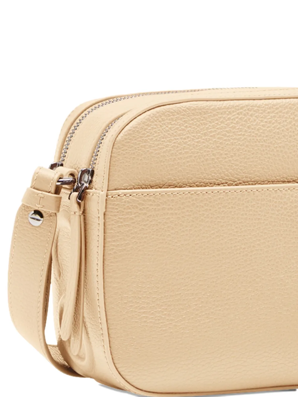 Светло-бежевый цвет, текстура под зернистую кожу, регулируемый плечевой ремень, передний накладной карман, застежка на молнию, внутренний накладной карман