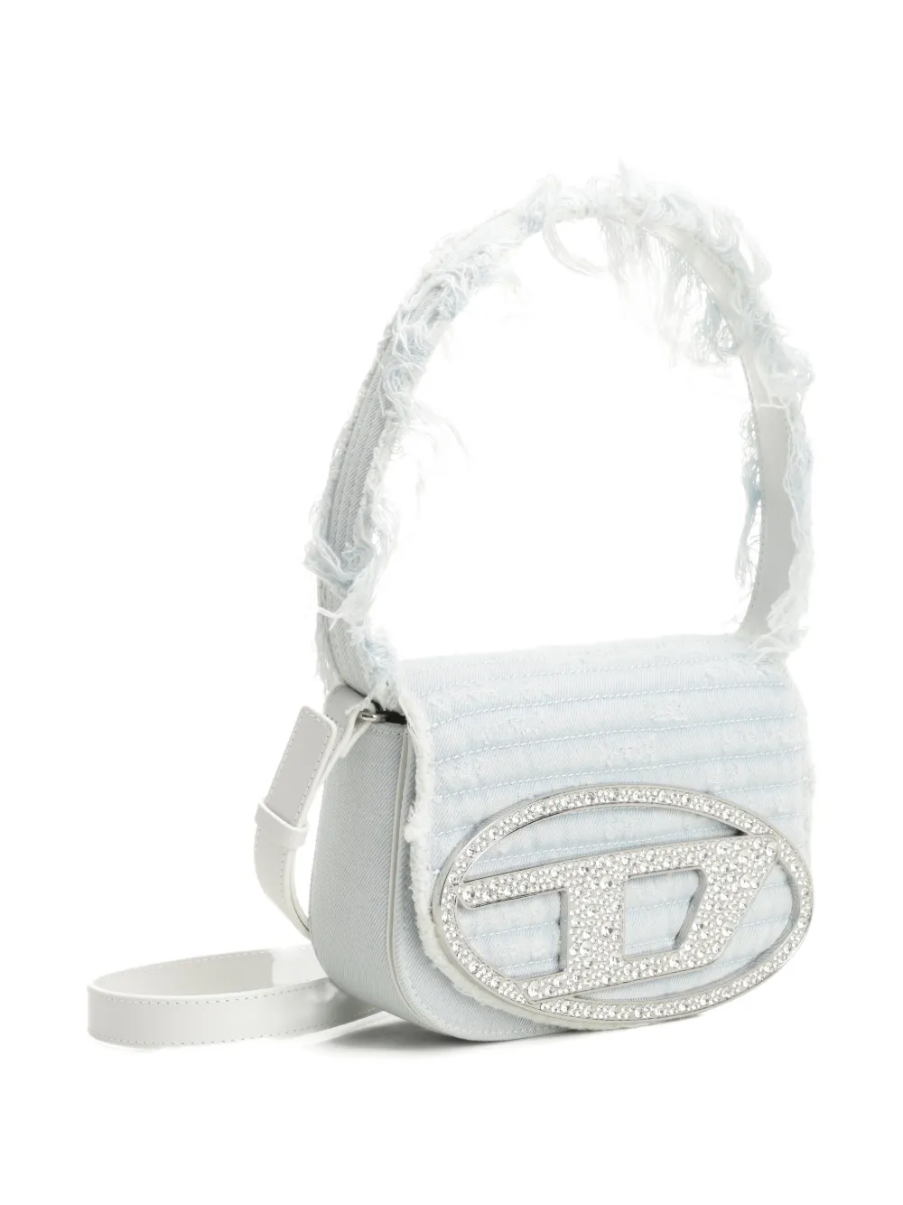 Светло-голубой с бахромой по краю, украшенный кристаллами, с логотипом-табличкой, регулируемым и съемным наплечным ремнем, верхней ручкой и клапаном