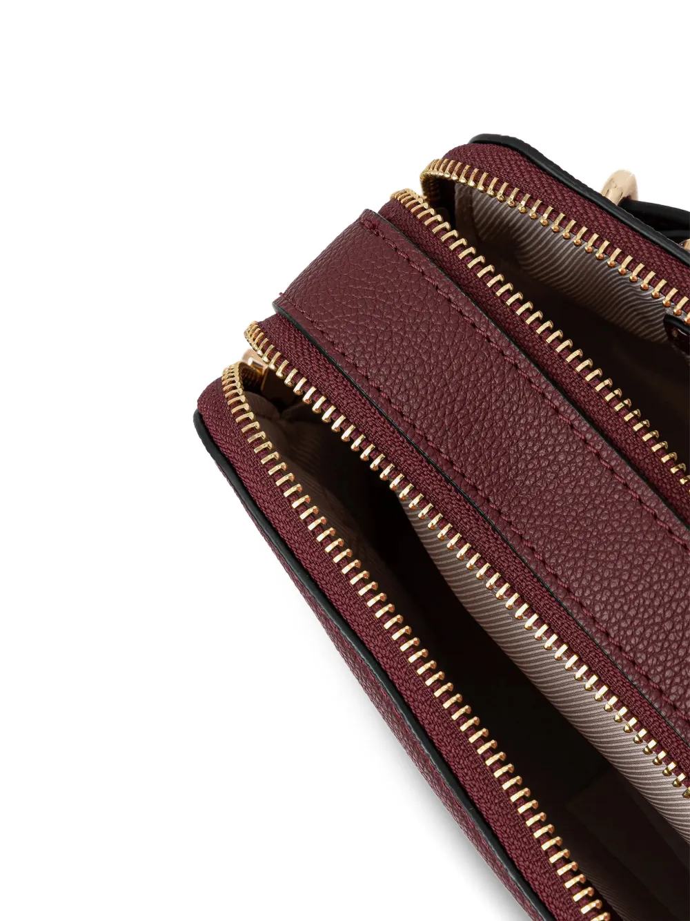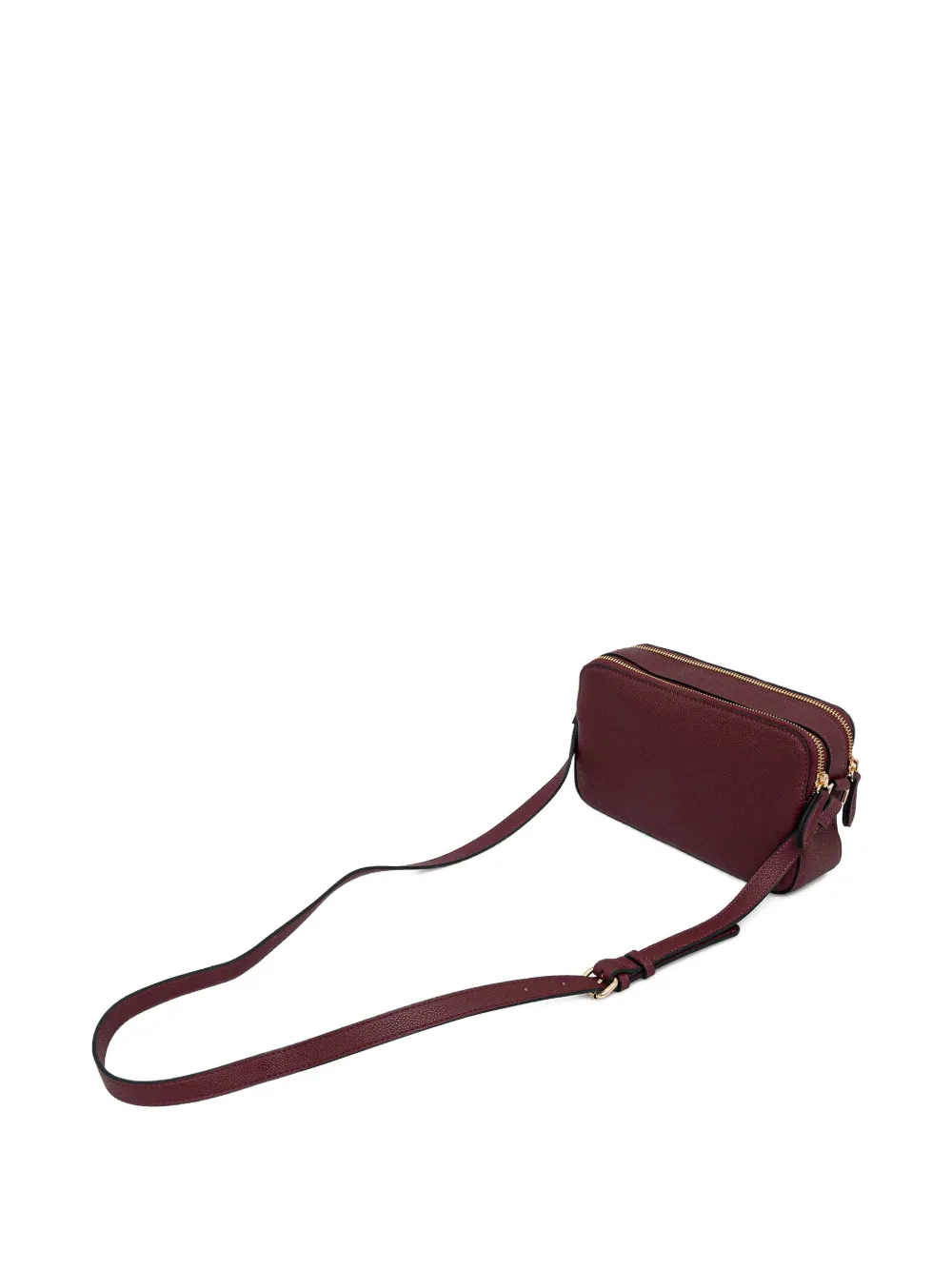 Бордовый цвет, фурнитура под золото, регулируемый плечевой ремень, верхняя застежка на молнии, фактурная зернистая кожа, два отделения