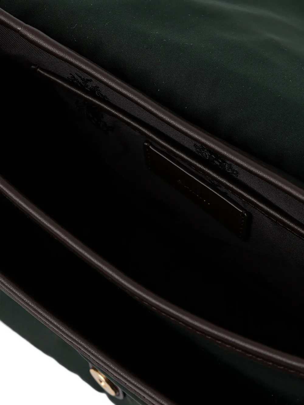 Темно-зеленый цвет, отделка темно-коричневого цвета, фурнитура золотистого оттенка, регулируемый плечевой ремень, застежка на пряжке, логотип