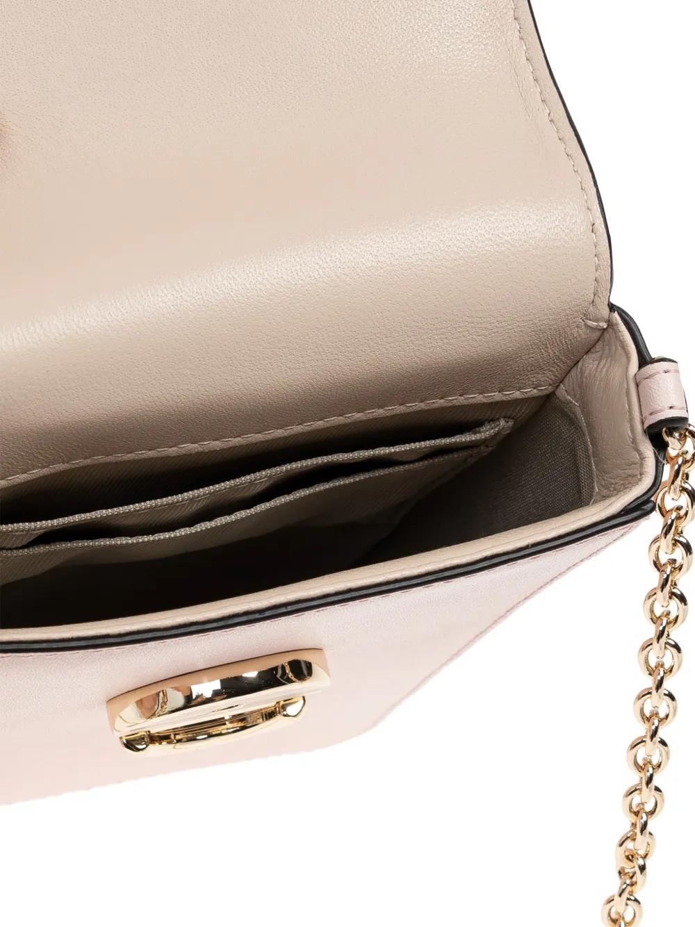 Светло-розовый наплечный ремень-цепочка, застежка с поворотным замком, фурнитура золотистого оттенка, основное отделение, внутренние открытые карманы