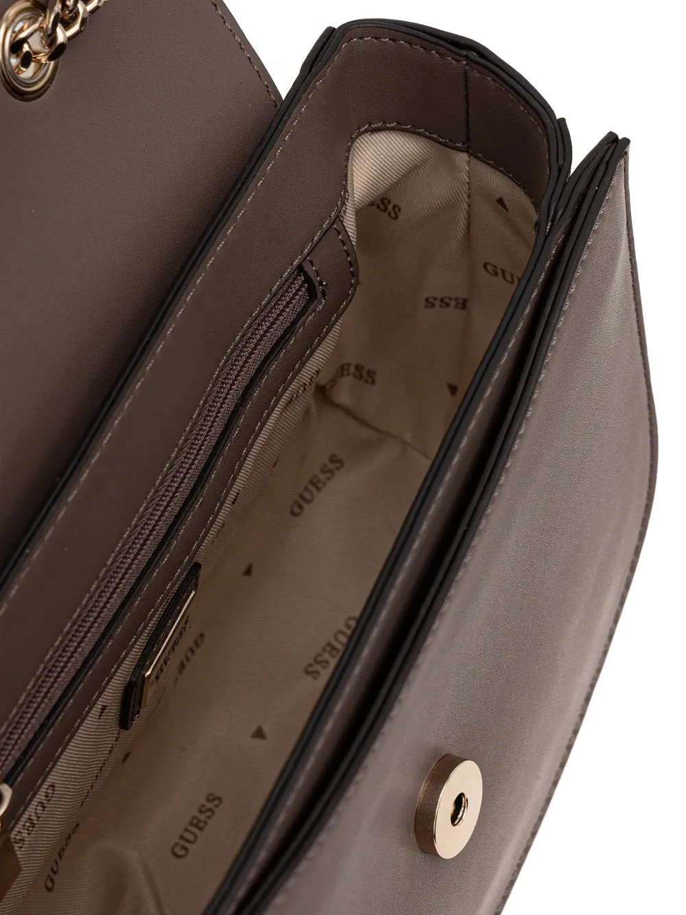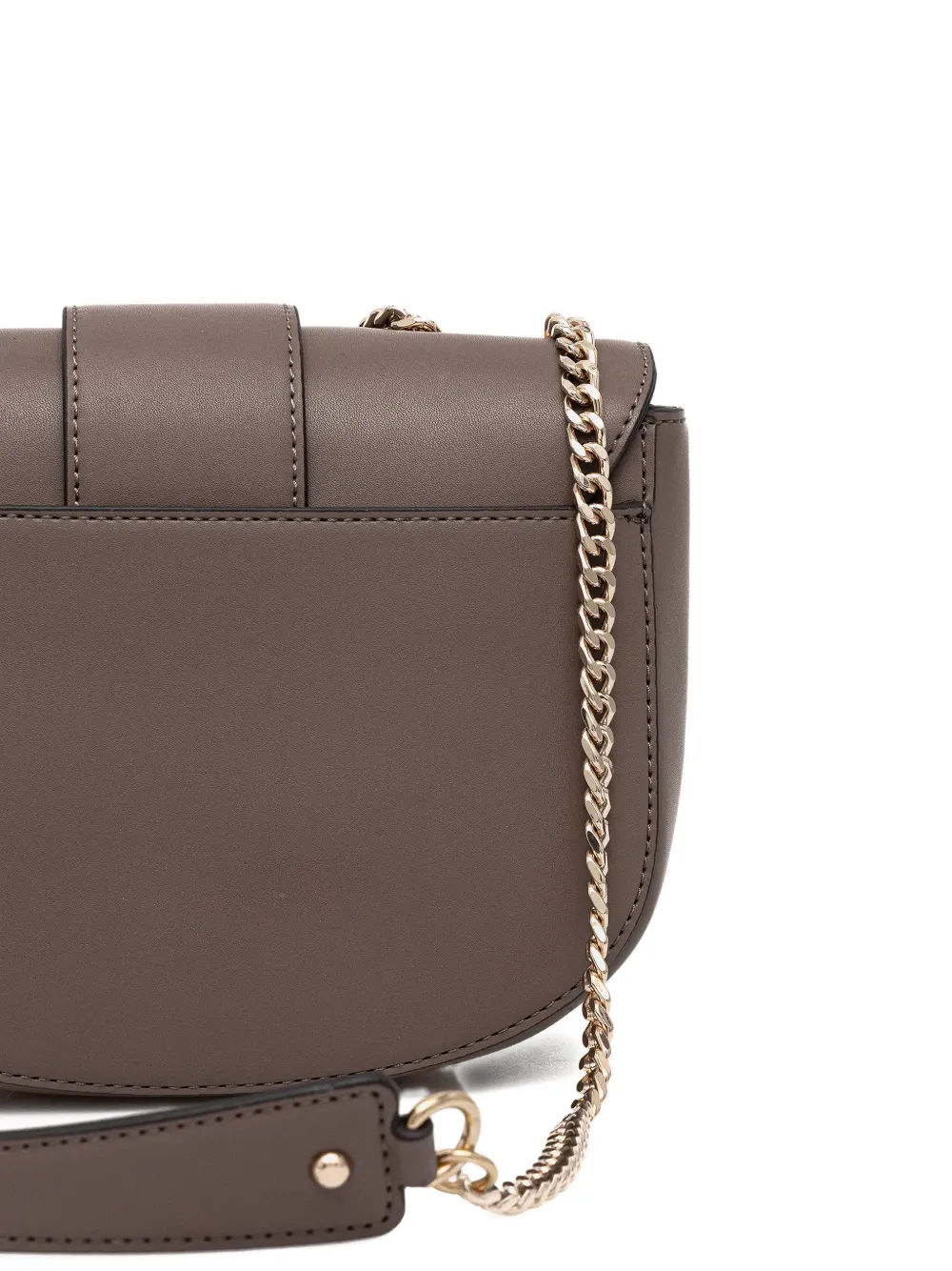 Коричневый, фурнитура золотистого оттенка, табличка с логотипом, плечевой ремень-цепочка, клапан на магнитной застежке, внутренний карман на молнии, основное отделение