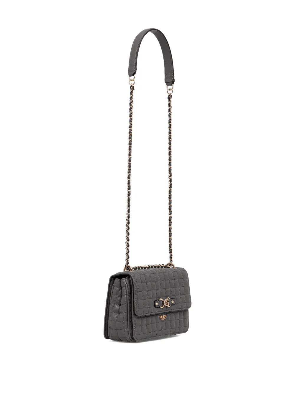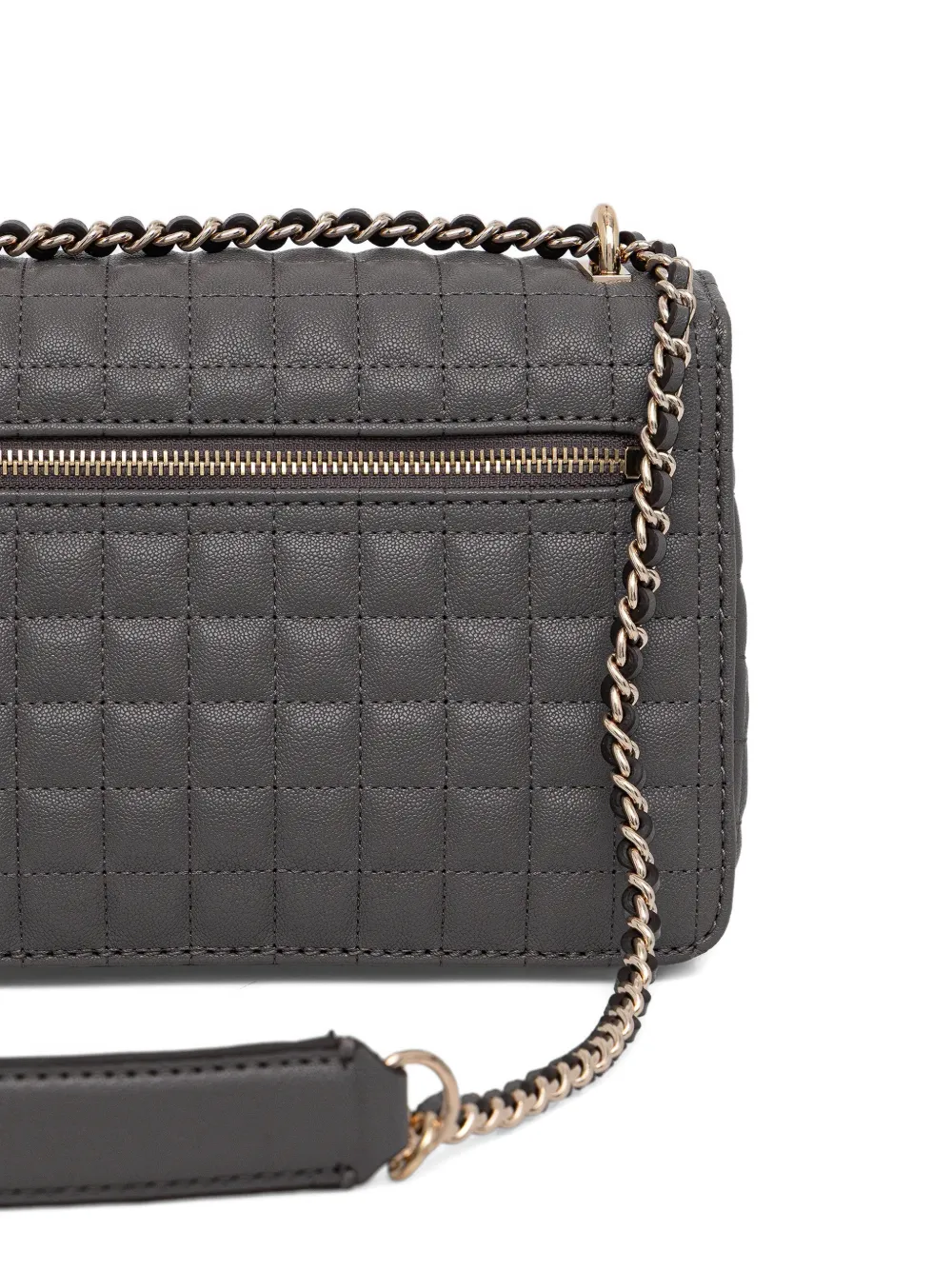 Серый цвет, стеганная отделка, ремень-цепочка, нашивка с логотипом, клапан на магните, внутренний карман на молнии, разделенный отсек