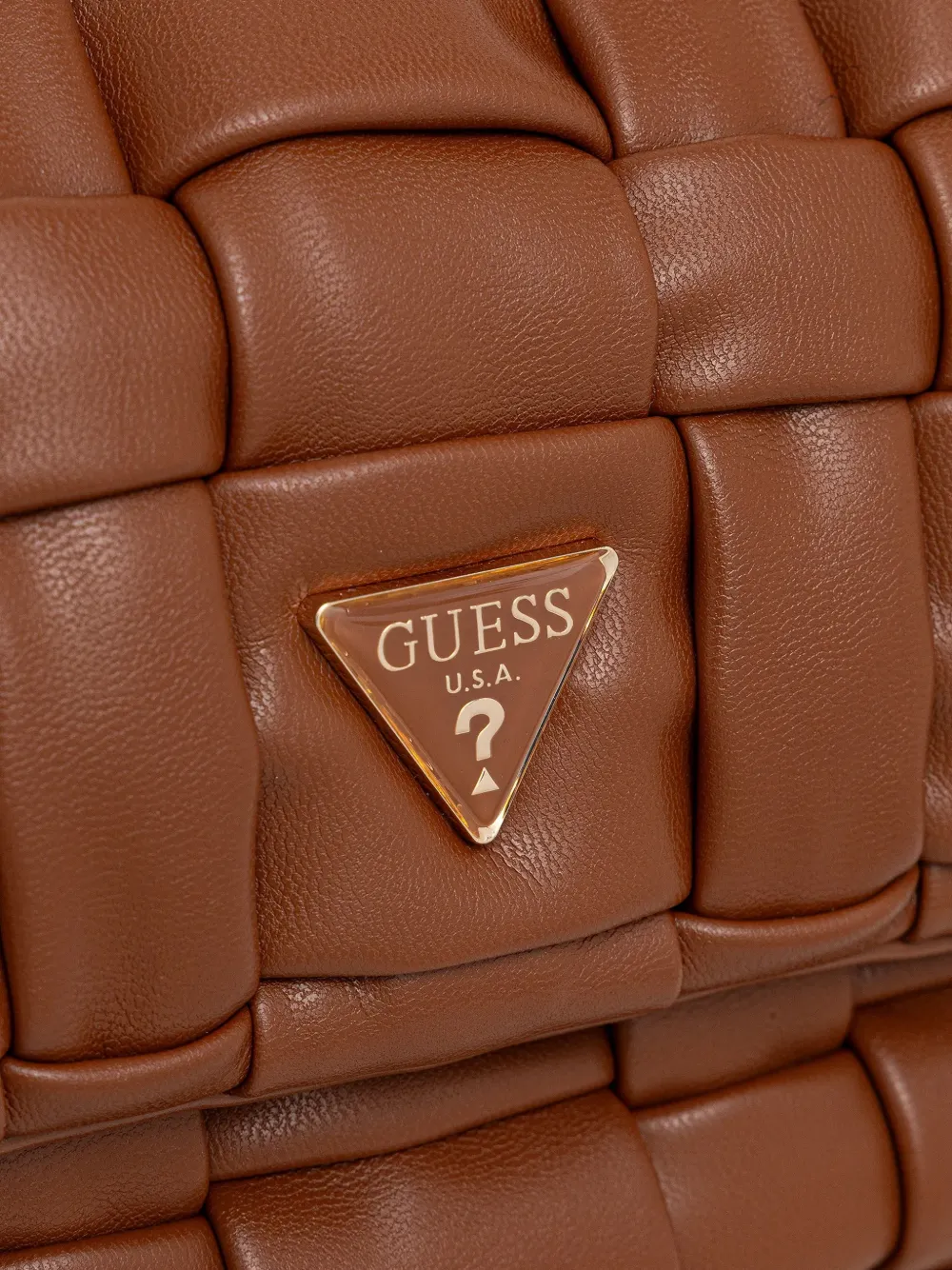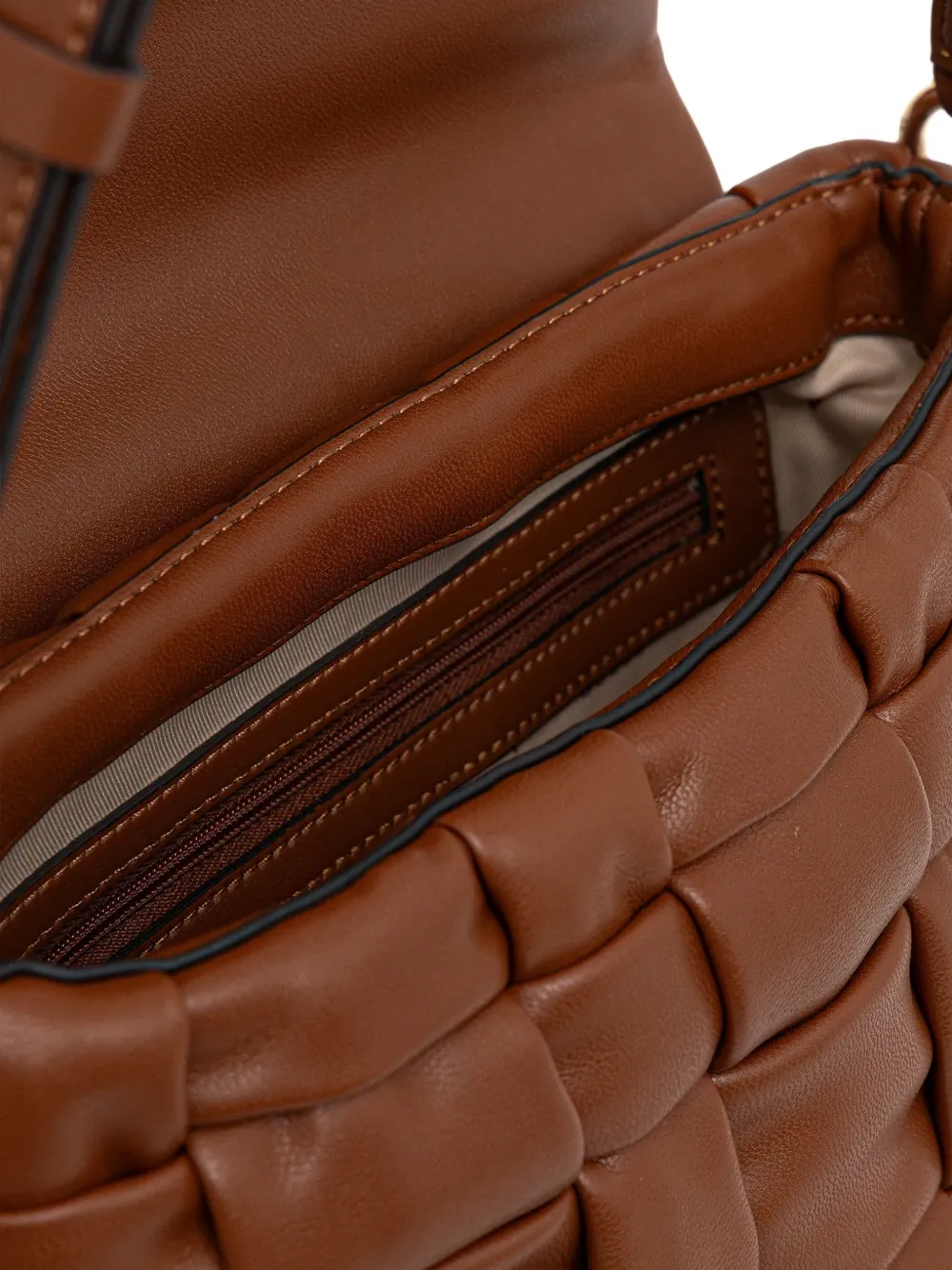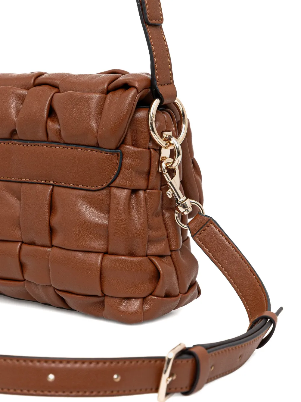 Коньячно-коричневый цвет, плетеный дизайн, съемный регулируемый плечевой ремень, фурнитура золотистого оттенка, нашивка с логотипом в форме треугольника, клапан на магнитной застежке, внутренний карман на молнии