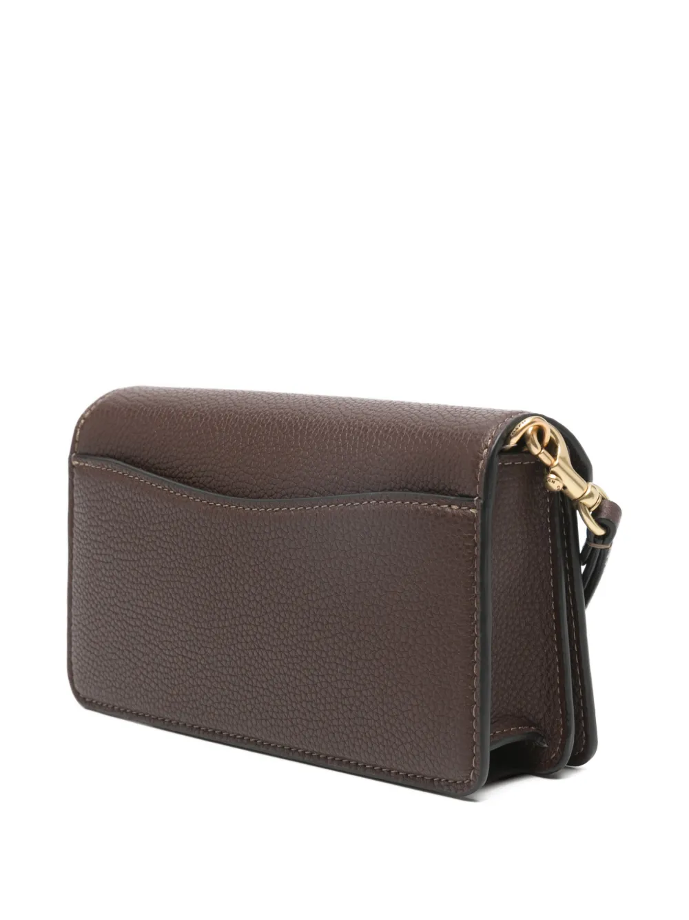 Коричневая зернистая текстура, фурнитура золотистого оттенка, съемный плечевой ремень-цепочка, застежка-клапан спереди, съемный ремешок на запястье, накладной карман сзади. Этот аксессуар поставляется в комплекте с защитным чехлом.