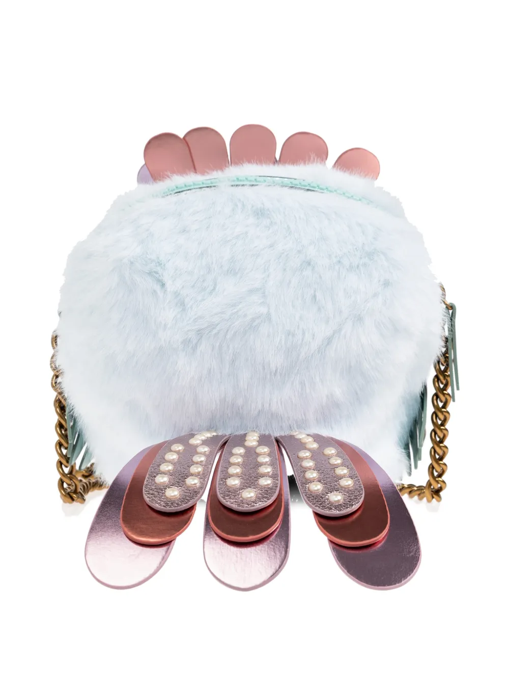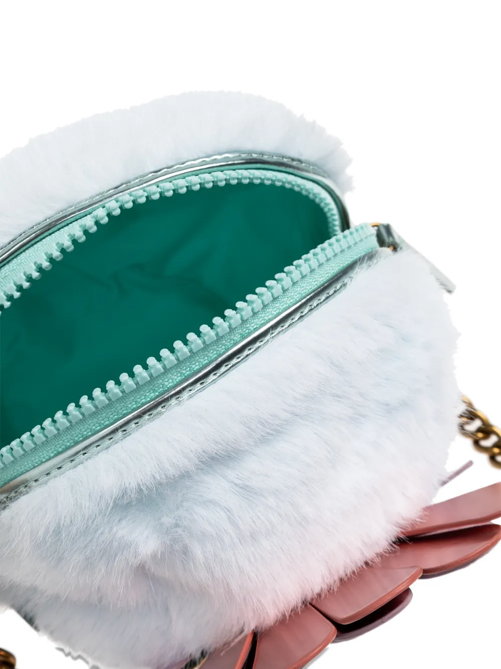 Бледно-голубая искусственная меховая фактура, украшенные детали, ремешок-цепочка, застежка на молнии