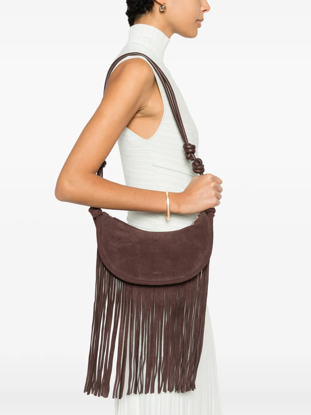 Коричневый замш цвета какао, отделка бахромой, застежка на молнии, регулируемый ремень, фурнитура золотистого цвета. В комплекте защитный мешочек для хранения.
