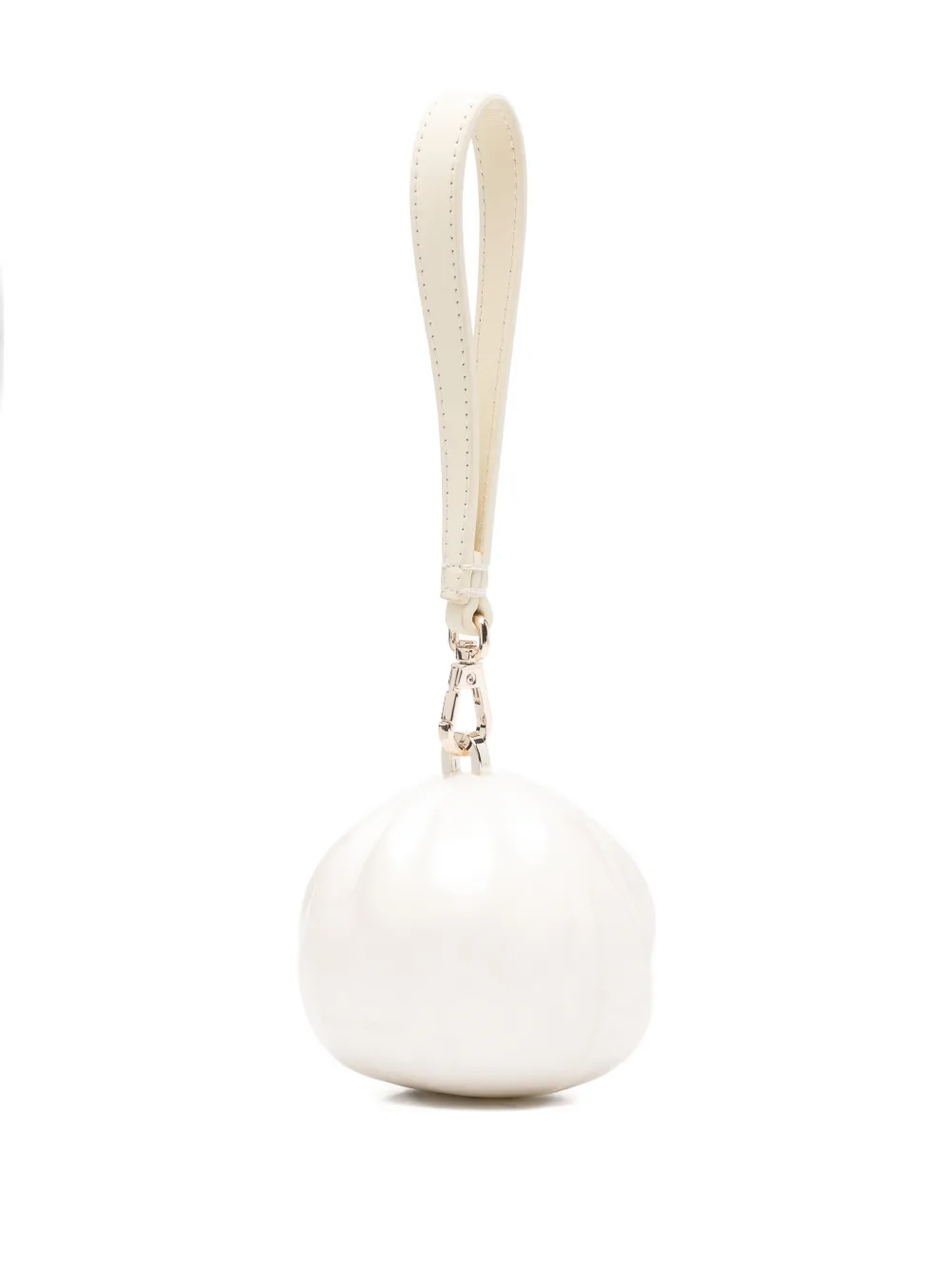 Жемчужно-белый, отделка искусственным жемчугом, верхняя ручка, дизайн в форме пельменя, застежка-защелка. В комплекте защитный чехол для хранения.