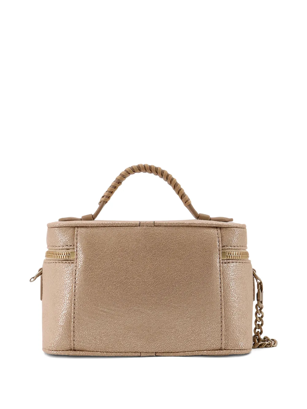 Бежевый и золотистого цвета цепочный плечевой ремень, застежка-молния, верхняя ручка, внутренний открытый карман, логотип