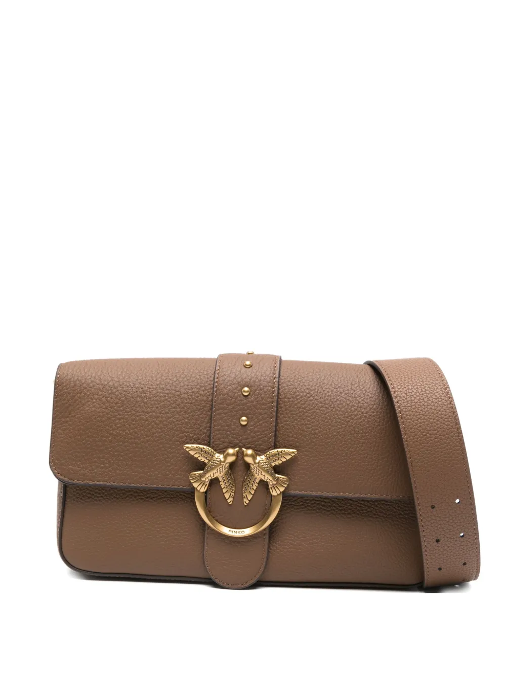 Коричневая зернистая кожа, золотистый декор Love Birds, регулируемый ремень, отделка заклепками, клапан-застежка
