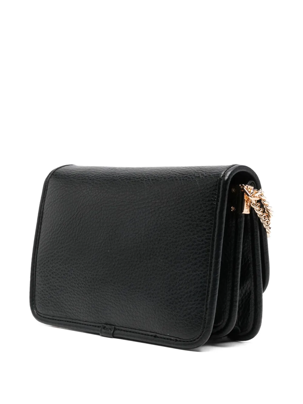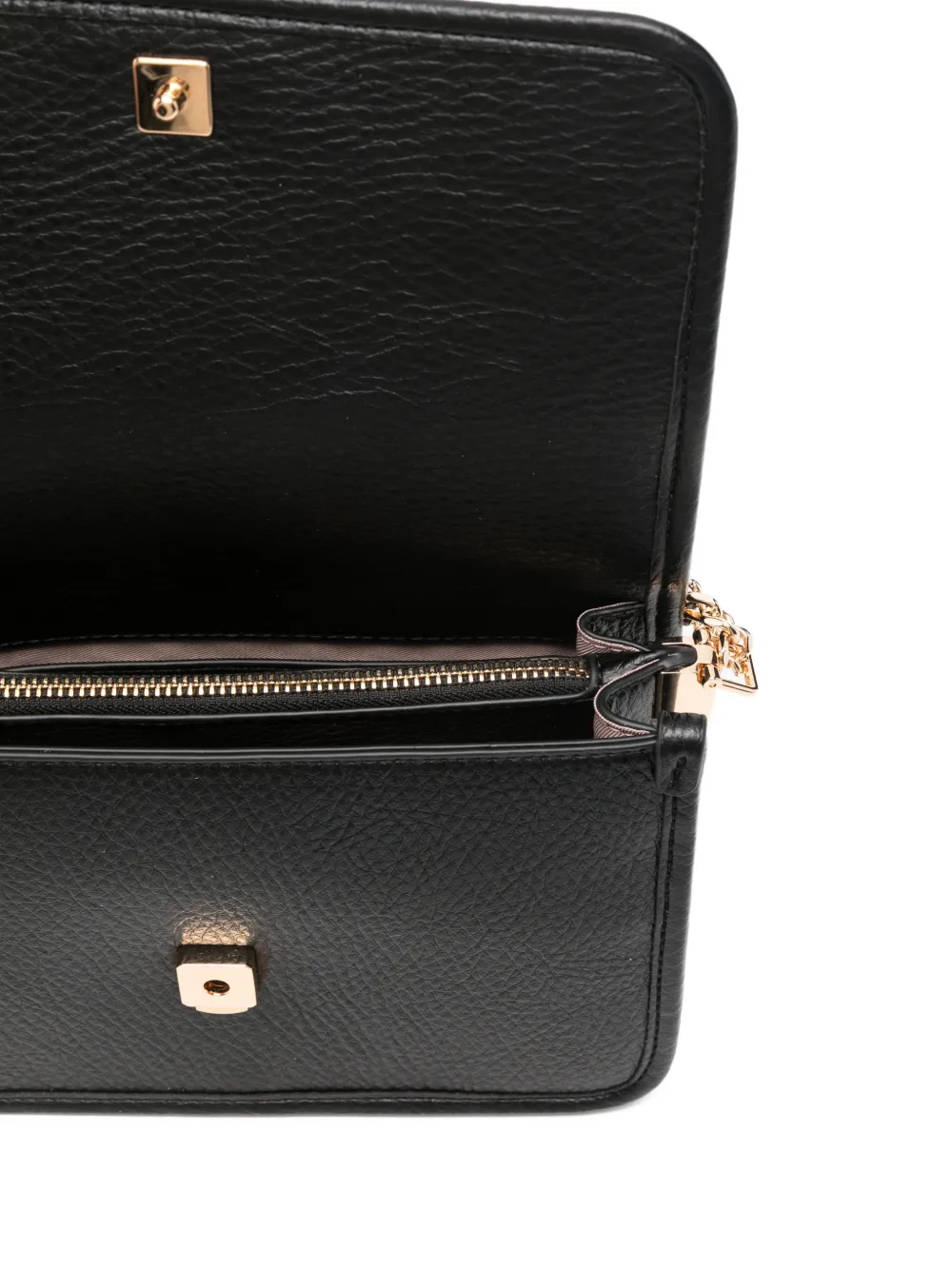 Черная зернистая отделка, фурнитура золотистого оттенка, плечевая цепочка, откидной клапан, внутренний карман на молнии