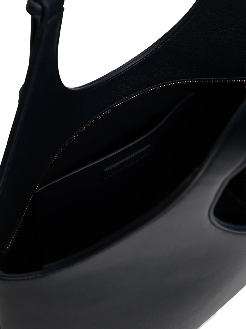 Синяя зернистая текстура, золотистая надпись с логотипом, внутренний открытый карман