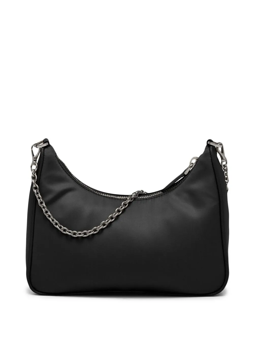 Черный, ECONYL, отделка из кожи Saffiano, треугольный эмалированный логотип, крепление для ключей, съемная косметичка, серебристая фурнитура, съемный регулируемый ремень на плечо, ремешок-цепочка на плечо, застежка на молнии сверху и основное отделение. Этот товар как минимум на 50% состоит из материалов, которые признаны более безопасными для окружающей среды, и/или произведены с использованием методов, которые помогают сократить потребление воды и химических веществ. Узнать больше о том, какие товары получают отметку «Ответственный выбор», можно из материала «Как мы оцениваем экологичность и этичность».