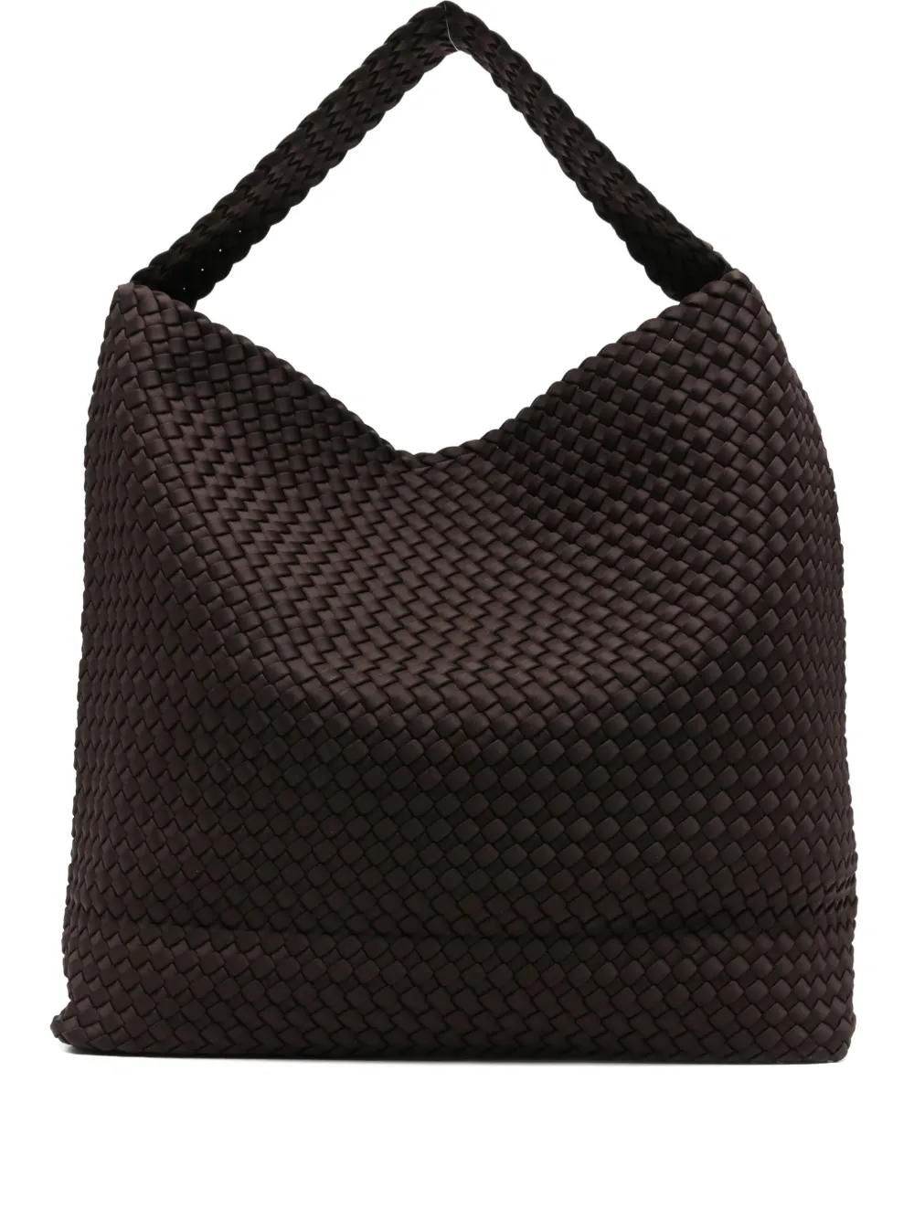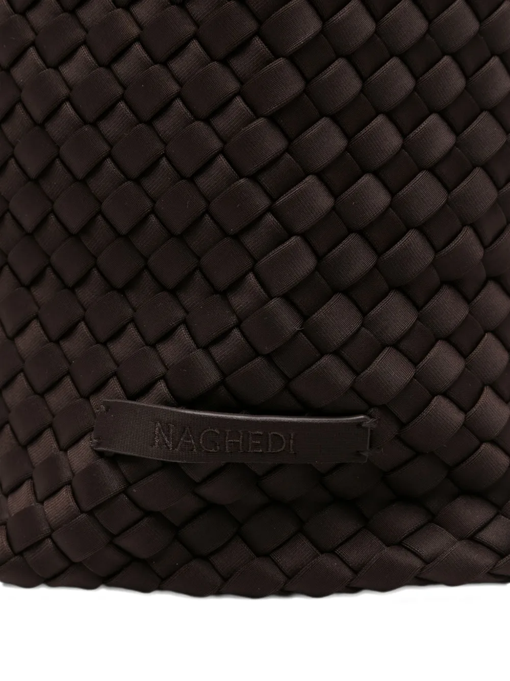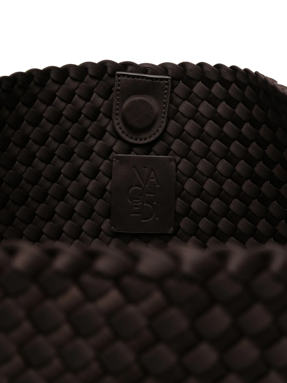 Коричневая сумка с плетеной текстурой, одной верхней ручкой, внутренним логотипом и магнитной застежкой