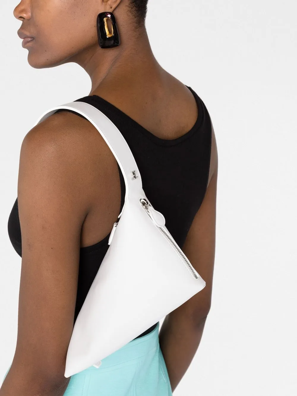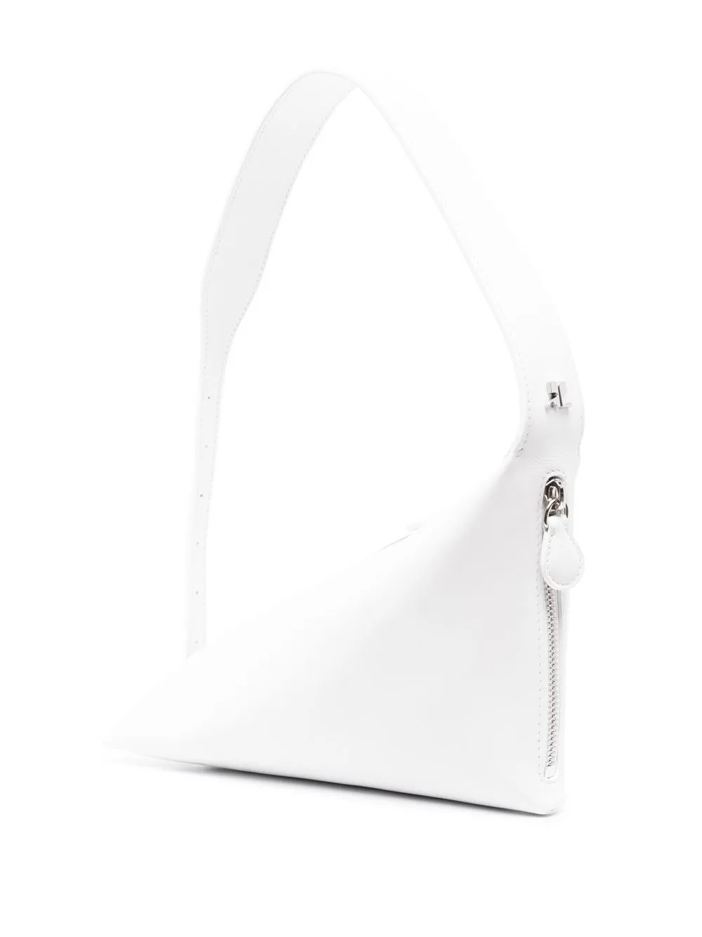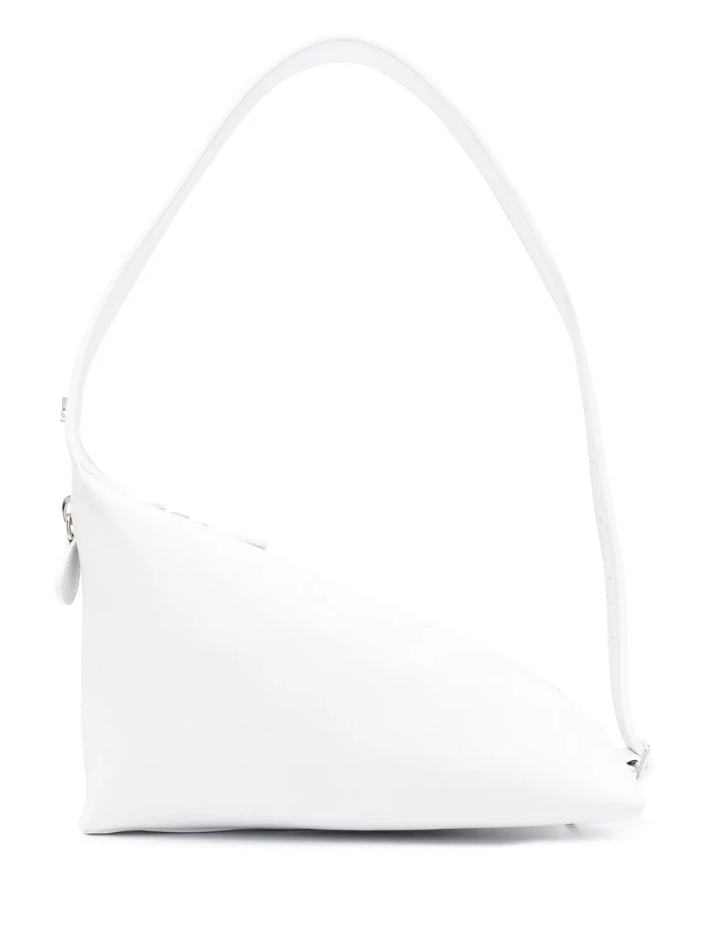 Белый, телячья кожа, асимметричная форма, ручка с плоским верхом, застежка на молнии сверху, застежки на молнии сбоку и основное отделение.